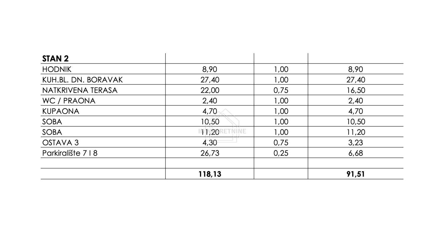 Stan se prostire na 118,13 m² bruto površine, dok korisna površina iznosi 91,51 m².