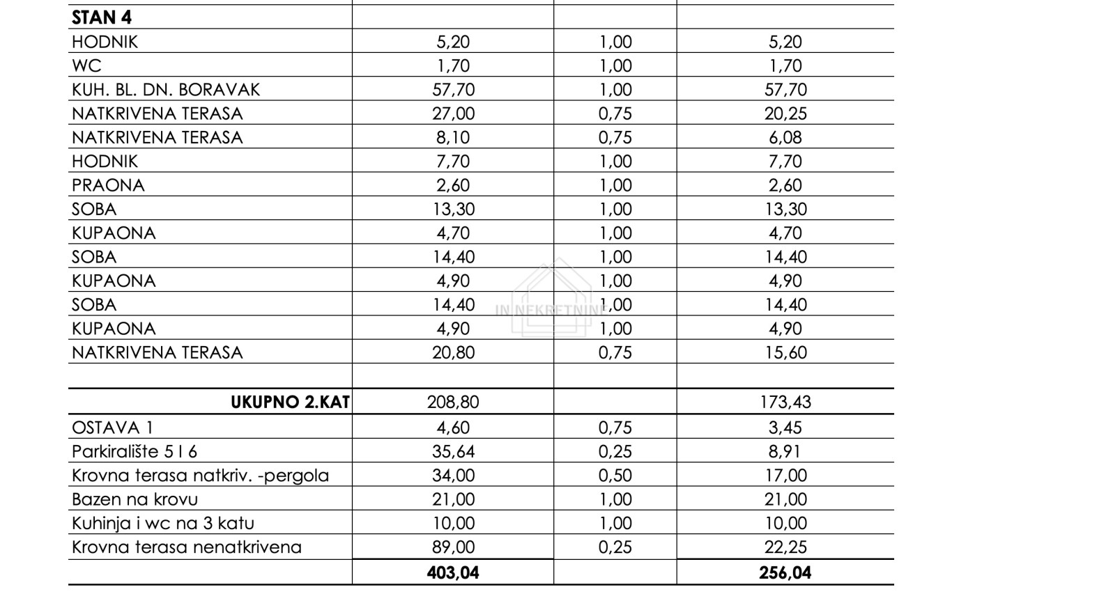 Penthouse se prostire na 403,04 m² bruto površine, dok korisna površina iznosi 256,04 m².