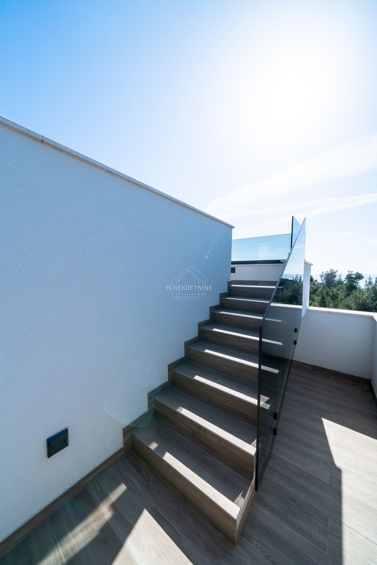 Na prodaju je moderan penthouse u novogradnji, smješten u mirnom dijelu Privlake, nedaleko od Zadra. Nalazi se u manjoj zgradi s ukupno šest stambenih jedinica, na odličnoj lokaciji idealnoj za odmor – svega 50 metara od mora i plaže.