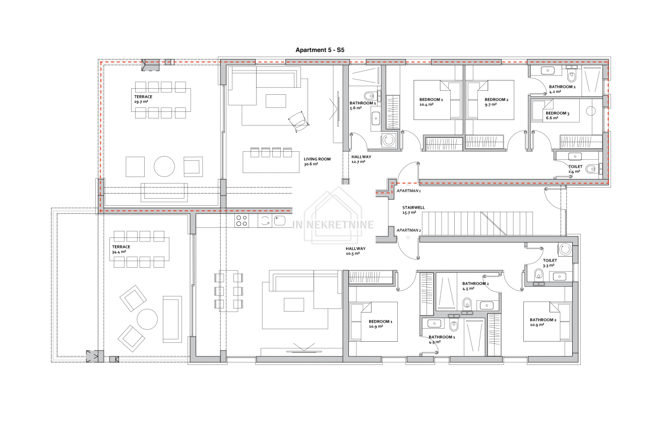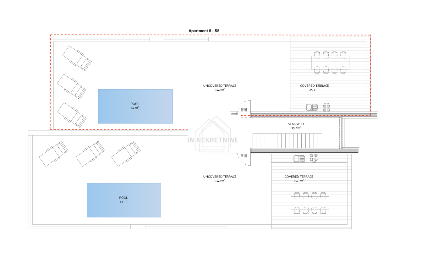 Na drugom katu nalazi se stambeni dio koji se sastoji od prostrane kuhinje s blagovaonicom i dnevnim boravkom, tri spavaće sobe, dvije kupaonice, odvojenog WC-a i hodnika. Iz dnevnog boravka se izlazi na lođu (30 m2) i natkrivenu terasu. Stanu pripada i krovna terasa površine 118,19 m2 s privatnim bazenom (12 m2), ljetnom kuhinjom i natkrivenim dijelom – savršena za uživanje tijekom toplih mediteranskih dana.