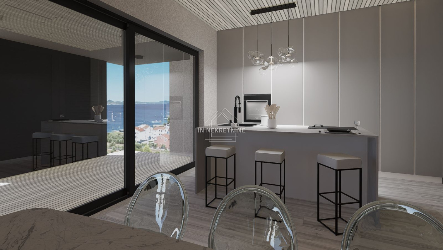 Ova izuzetna nekretnina nalazi se na prvom katu zgrade i nudi otvoren pogled na Pašmanski kanal, a uz prostranu krovnu terasu idealna je za uživanje u zalascima sunca i mediteranskom načinu života.
