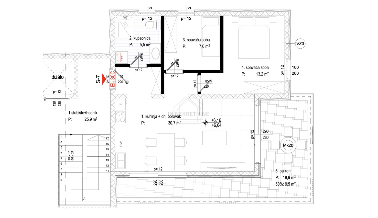 Ukupna neto površina stana s pripadcima je 94,58 m².