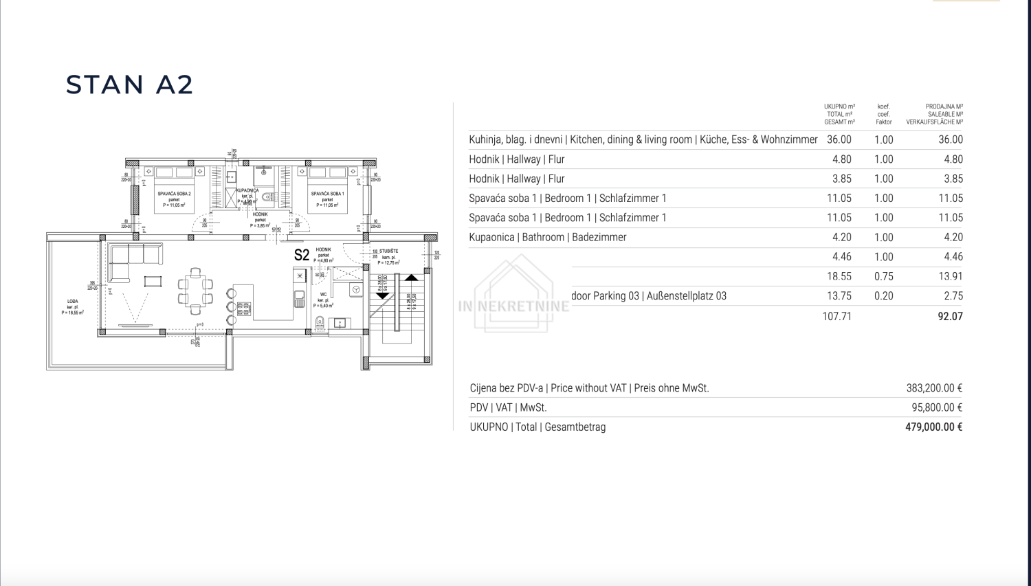 Stan A2 nalazi se na prvom katu i ističe se iznimnom kvalitetom gradnje i vrhunskim materijalima. Kvaliteta gradnje i pažnja prema detaljima izdvajaju ovu nekretninu kao pravu rijetkost na tržištu.