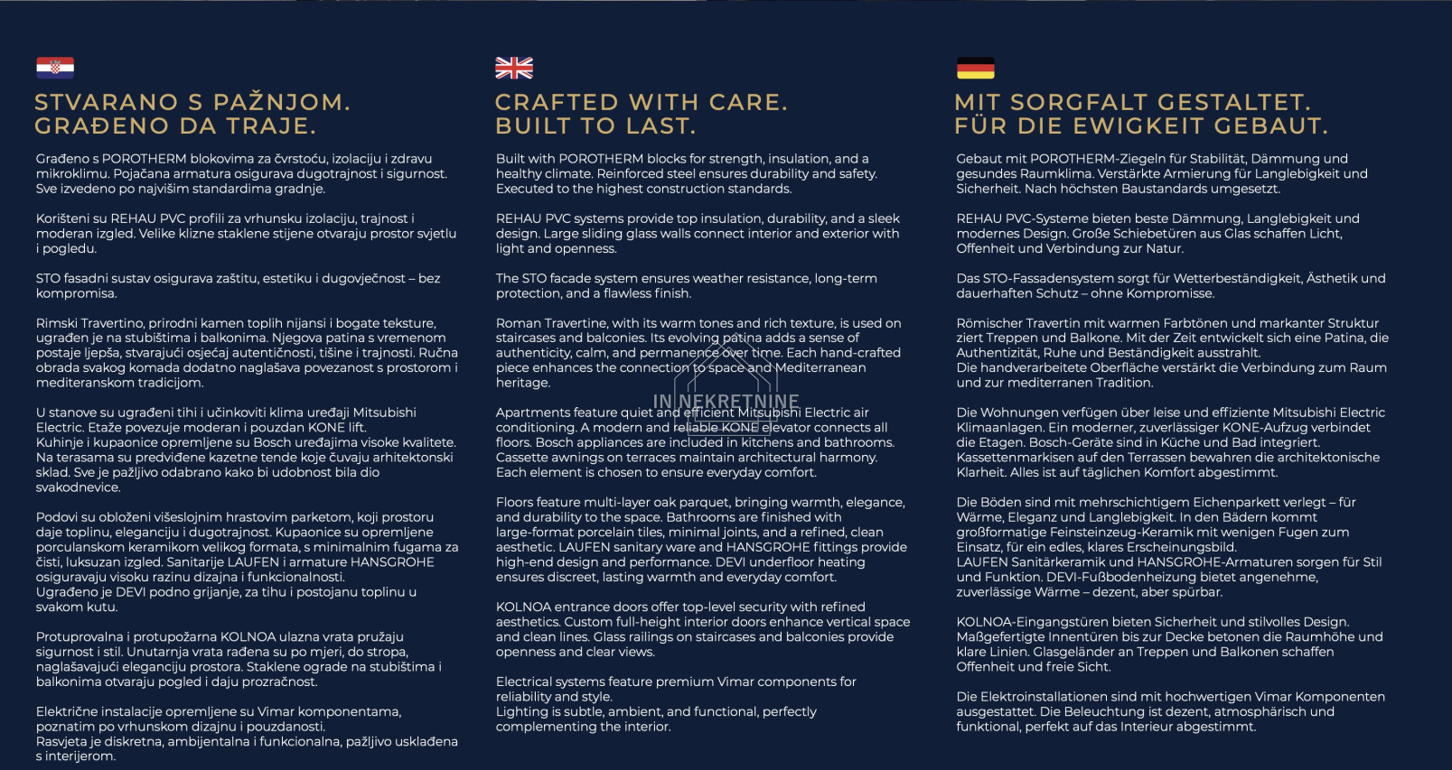Na mirnoj lokaciji u Sukošanu prodaje se moderan i luksuzan stan smješten na prvom katu manje stambene zgrade. Zgrada je u visokoj fazi izgradnje. Ova visoko kvalitetna novogradnja sastoji se od svega tri stambene jedinice – svaka smještena na vlastitoj etaži, što pruža dodatnu privatnost i udobnost stanovanja. U zgradi je ugrađen moderni KONE lift koji dodatno povećava komfor i funkcionalnost. Ova nekretnina savršena je kao luksuzni dom ili investicija za najam. Lokacija pruža mir, ali i blizinu svih sadržaja potrebnih za svakodnevni život.