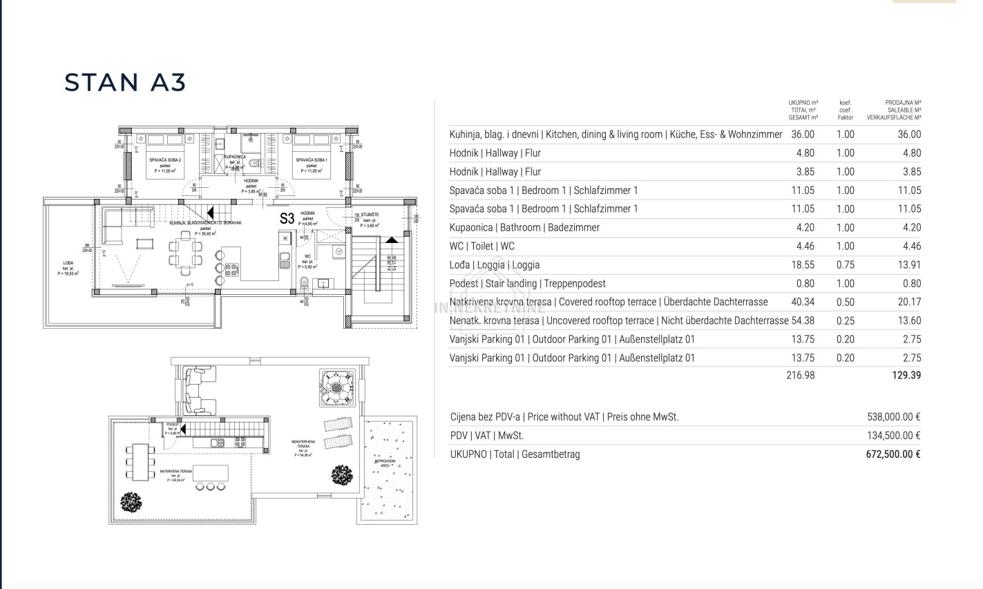 Stan A3 nalazi se na drugom katu i ističe se iznimnom kvalitetom gradnje i vrhunskim materijalima. Stan ima i vlastitu privatnu krovnu terasu s koje se pruža prekrasan pogled na more. Kvaliteta gradnje i pažnja prema detaljima izdvajaju ovu nekretninu kao pravu rijetkost na tržištu.