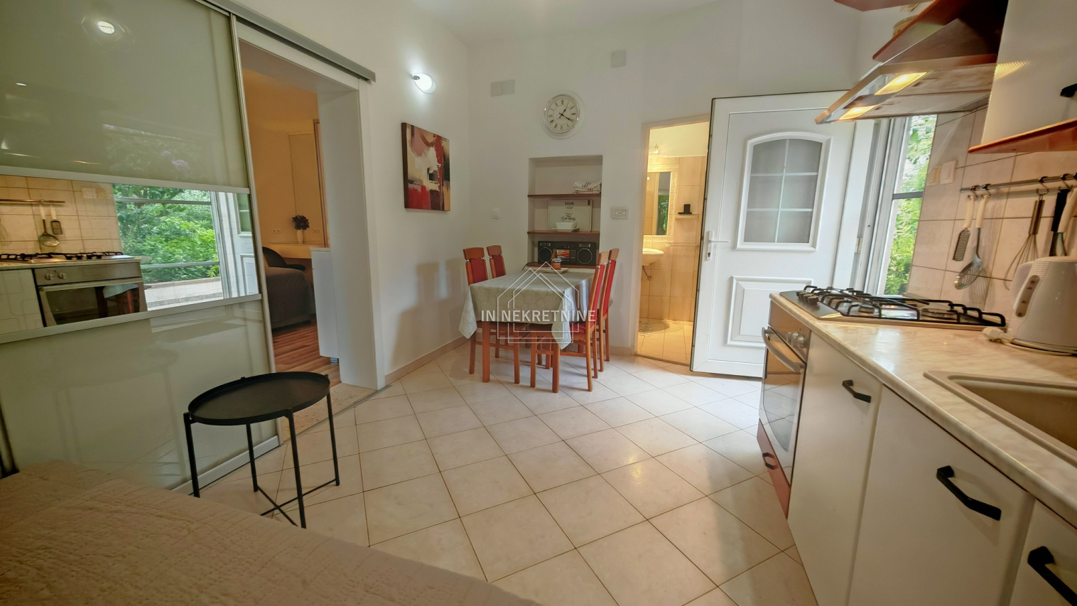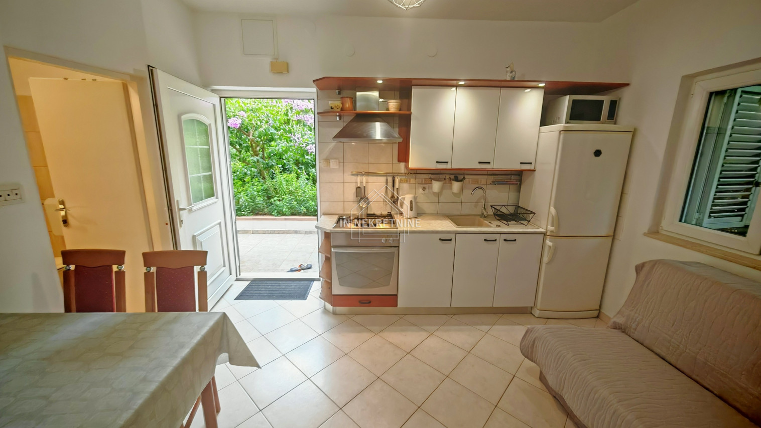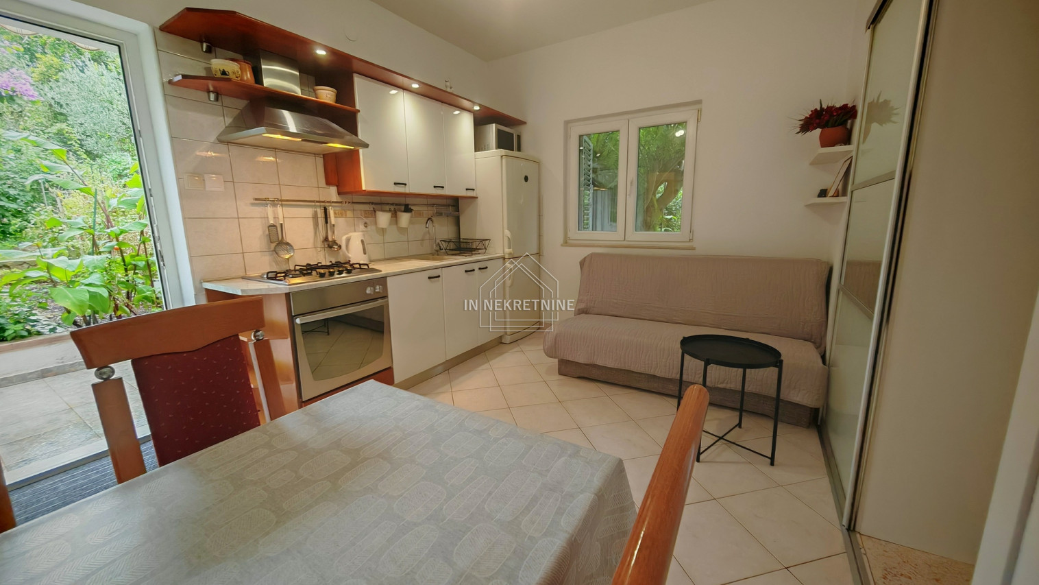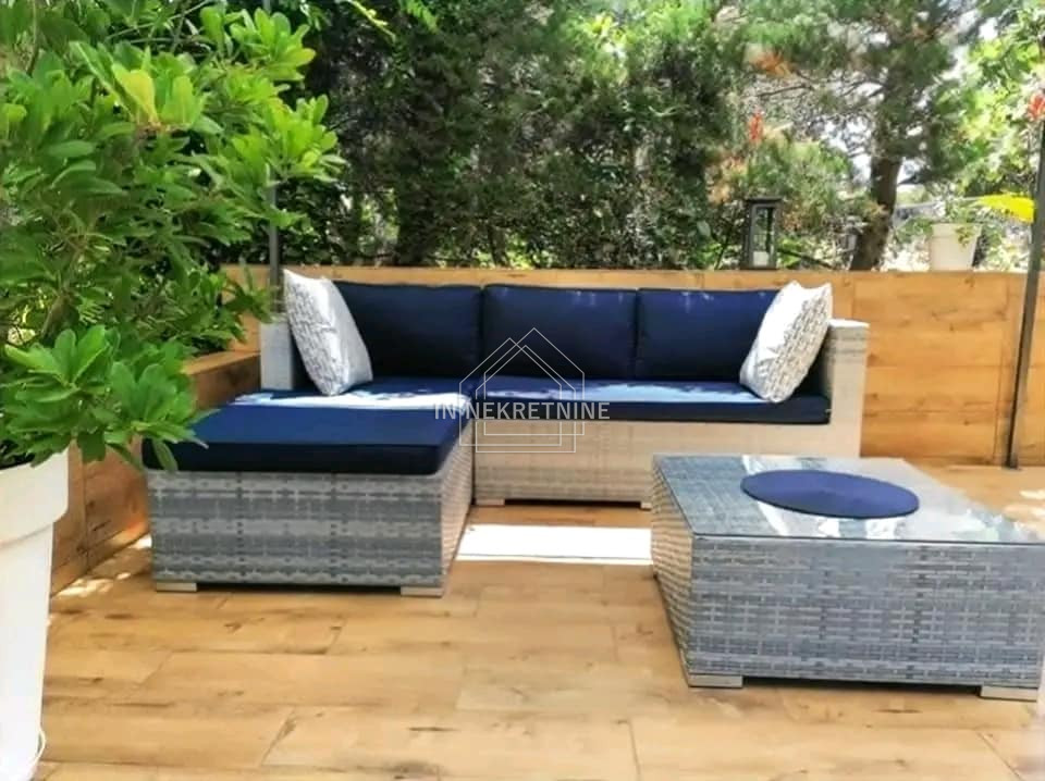 Stan ima stambenu površinu od 35,78 m² i sastoji se od spavaće sobe, kuhinje i kupaonice. Dodatnu vrijednost daju lođa/balkon površine 10 m², uređena terasa u vrtu od oko 20 m², kao i dva uređena vrta ukupne površine 136 m² s nasadima mandarina i cvjetnjakom. U sklopu nekretnine nalazi se i parkirno mjesto te malo spremište.
