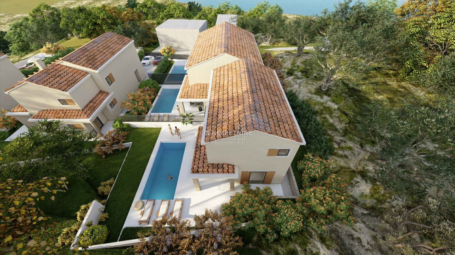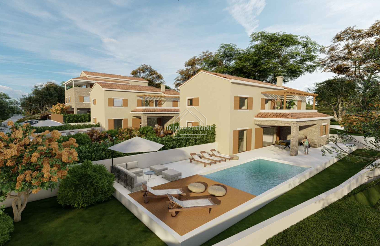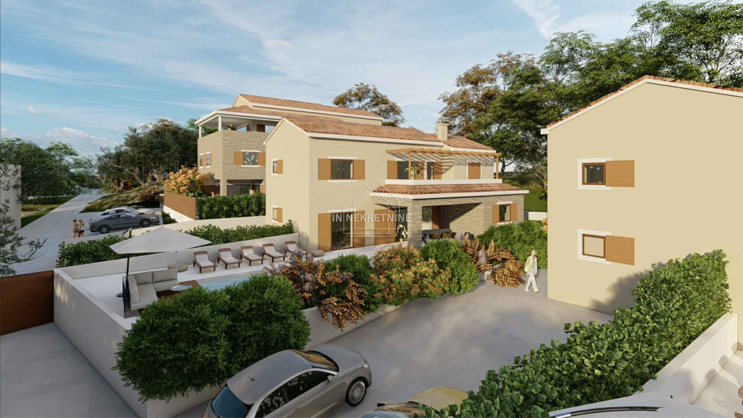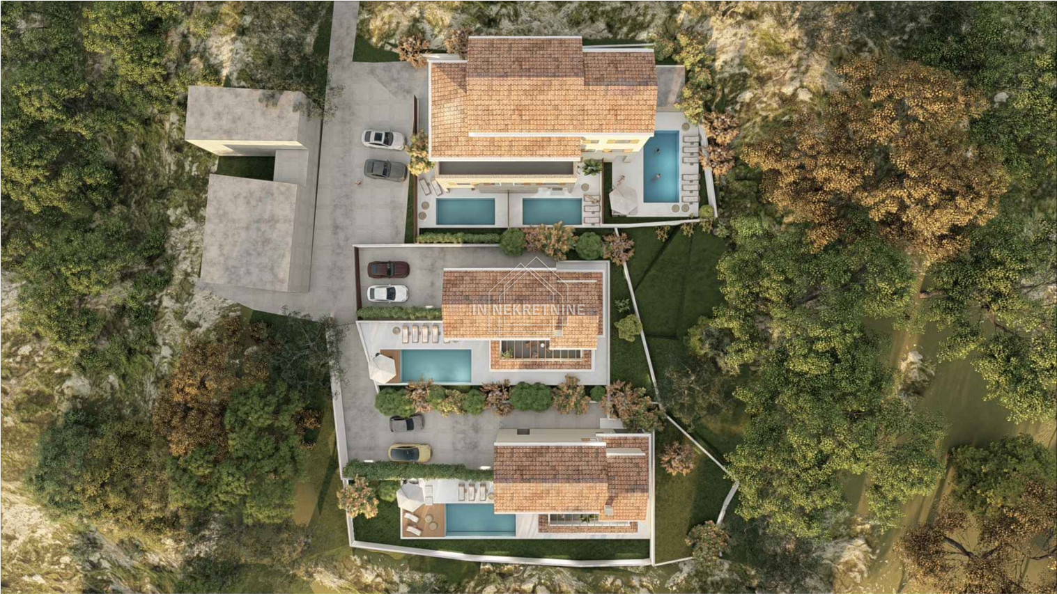 Na jednoj parceli planirana je stambena zgrada s tri dvoetažne jedinice, svaka sa vlastitim bazenom.