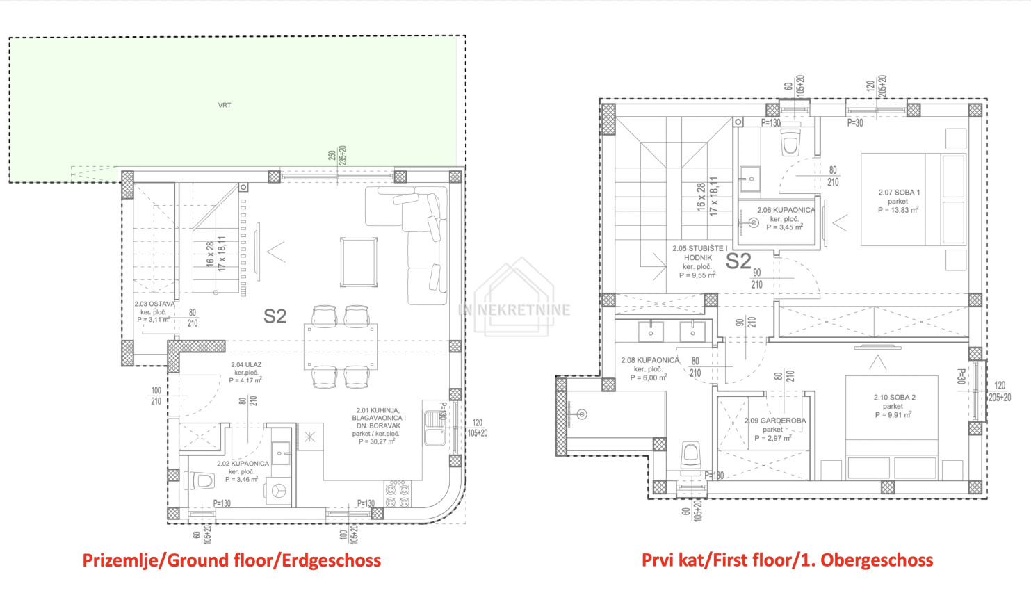 Apartmanu pripada privatni vrt površine 28,52 m², te dva vanjska parkirna mjesta.