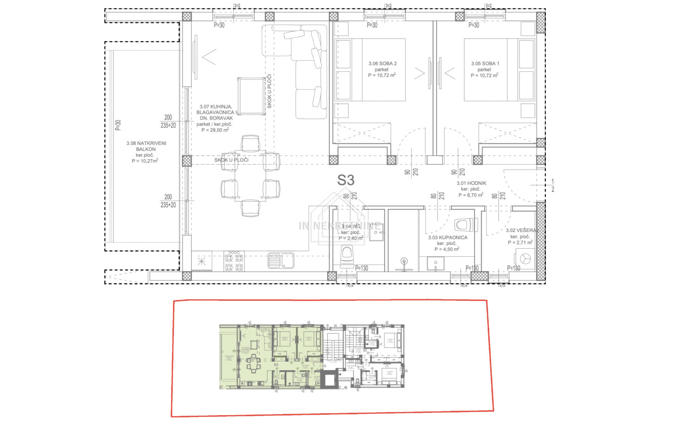 Ukupna bruto površina iznosi 106,69 m², dok netto prodajna površina stana iznosi 79,56 m².
