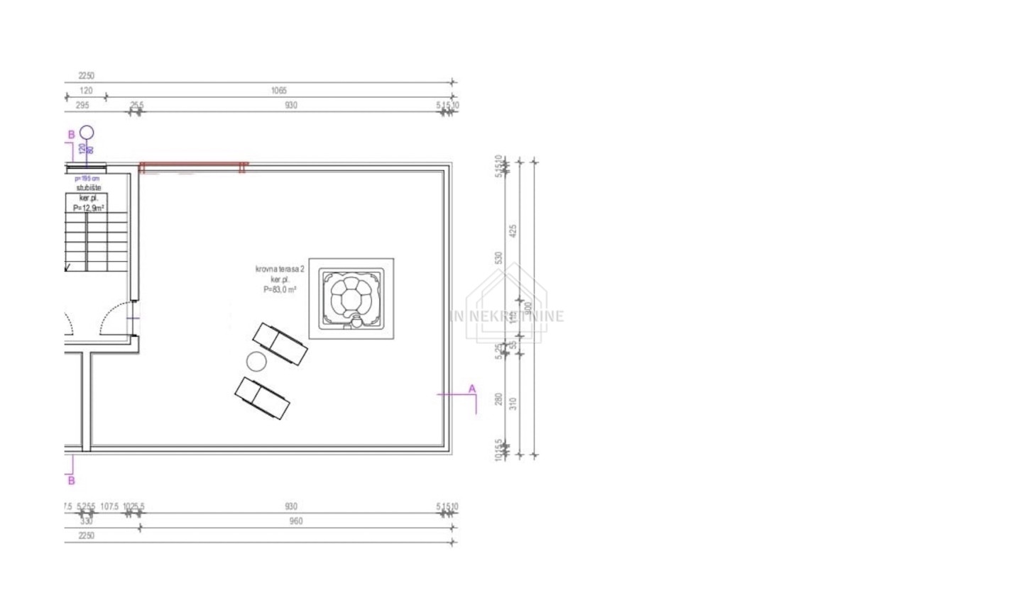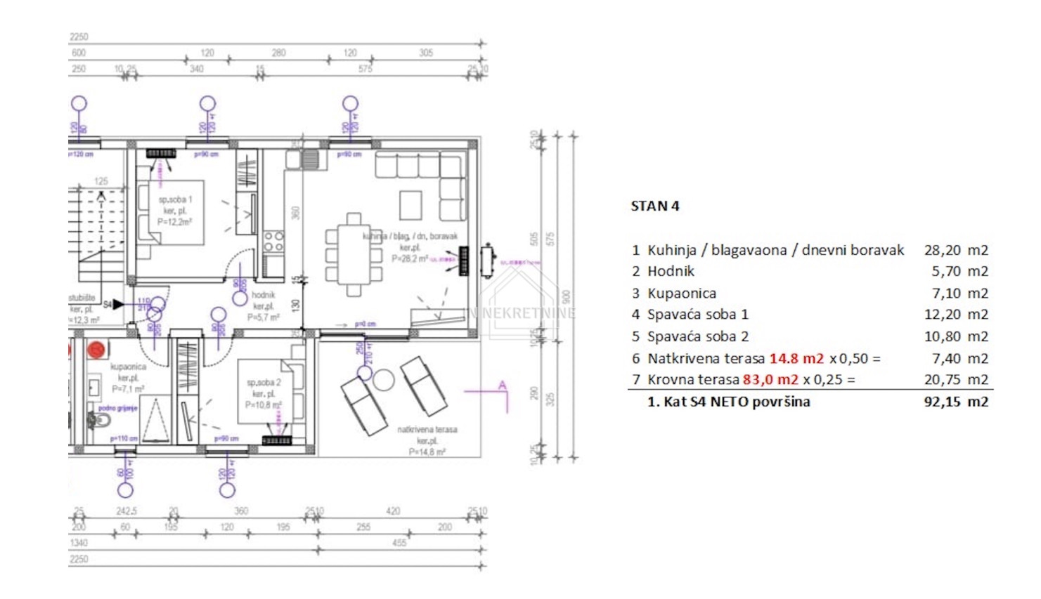 Stan se sastoji od: open space kuhinje, blagovaonice i dnevnog boravka, hodnika, 2 spavaće sobe, kupaonice, natkrivene terase i krovne terase (83 m²). Stanu pripadaju dva vanjska parkirna mjesta.