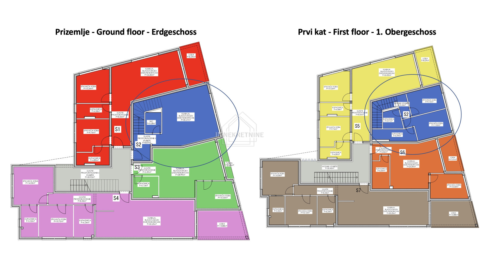 - Prizemlje: hodnik, kuhinja, blagovaonica i dnevni boravak (open space), wc, terasa i vrt-zelenilo, stubište