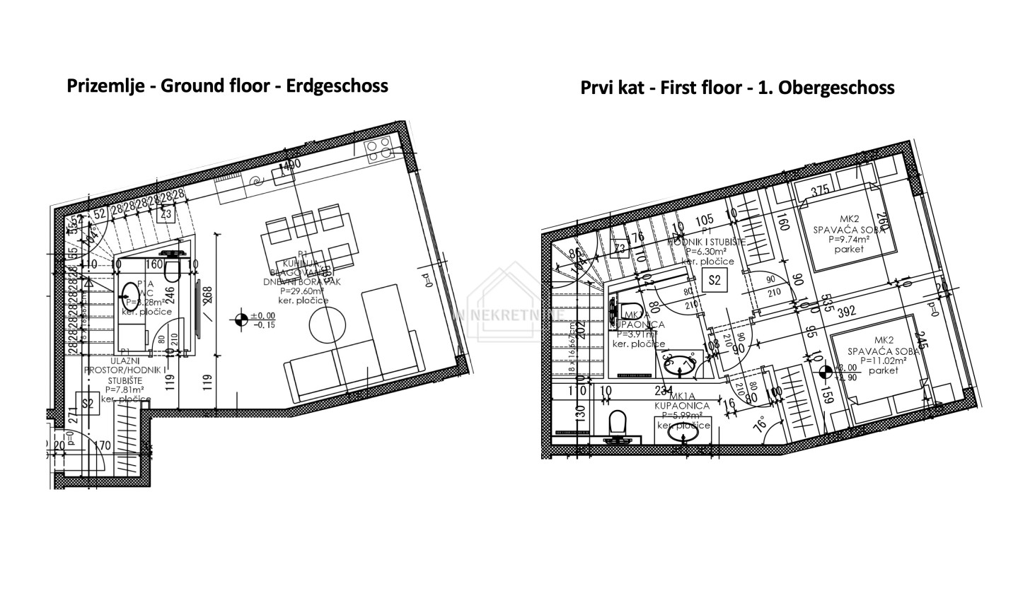 - Prvi kat: dvije spavaće sobe, hodnik, kupaonica