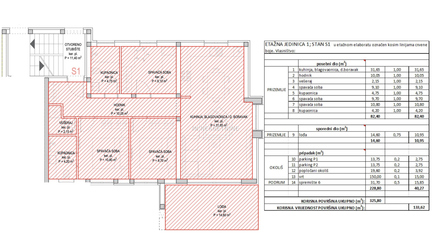 Ukupna podna površina iznosi 325,80 m², a ukupna korisna vrijednost površine stana iznosi 133,62 m².