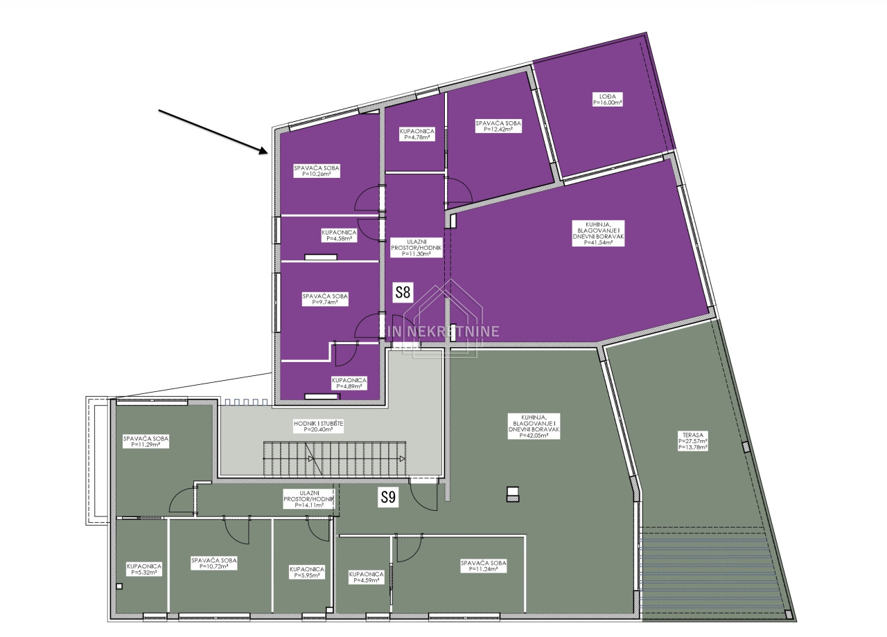 - hodnika, kuhinje, blagovaonice i dnevnog boravka (open space), kupaonice, tri spavaće sobe (dvije od njih imaju vlastite kupaonice) i lođe.