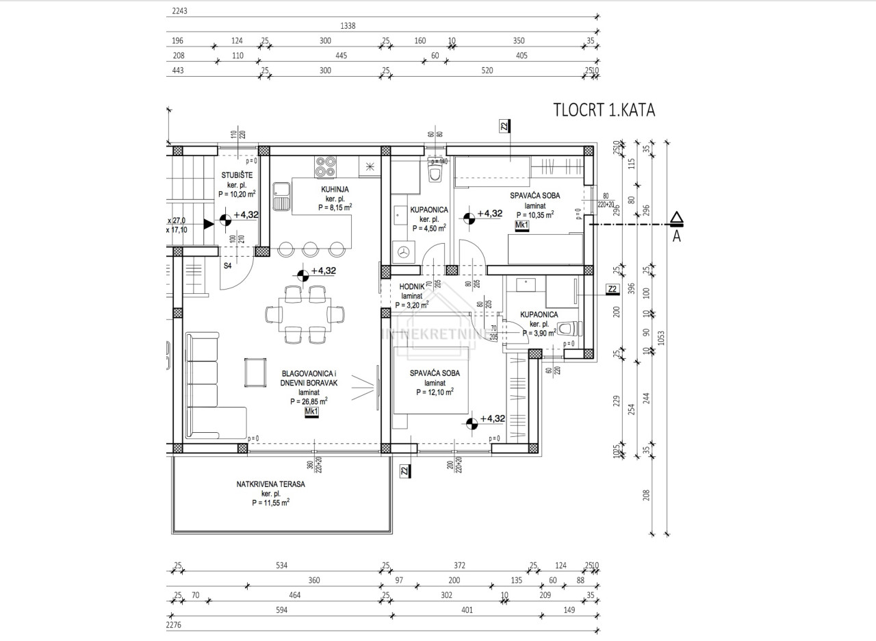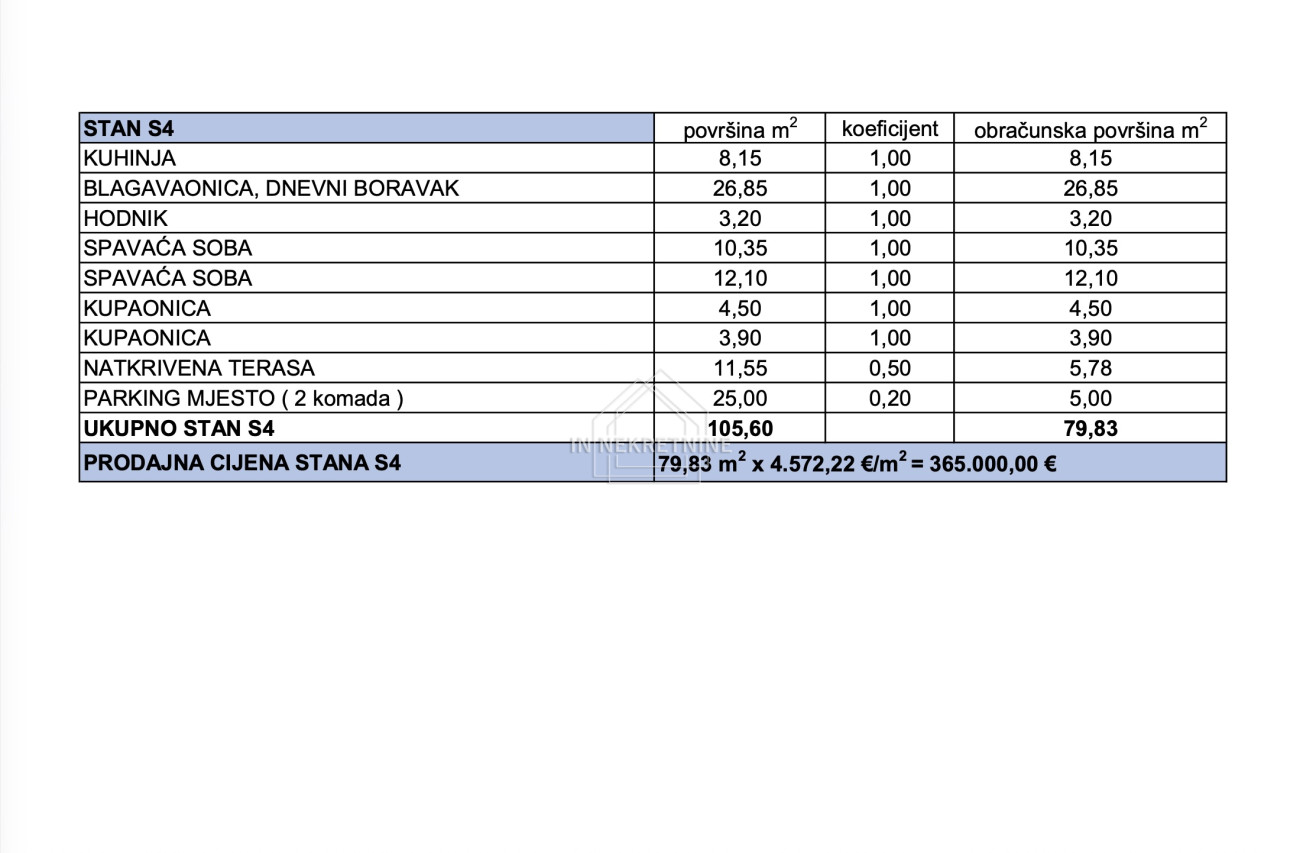 Bruto površina iznosi 105,60 m², dok neto prodajna površina iznosi 79,83 m².