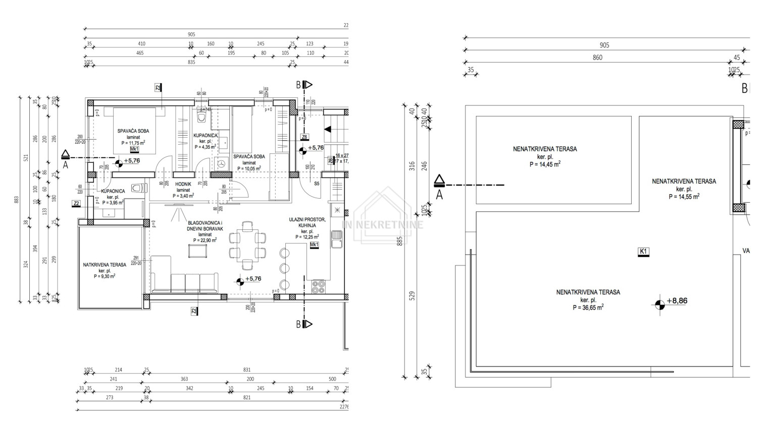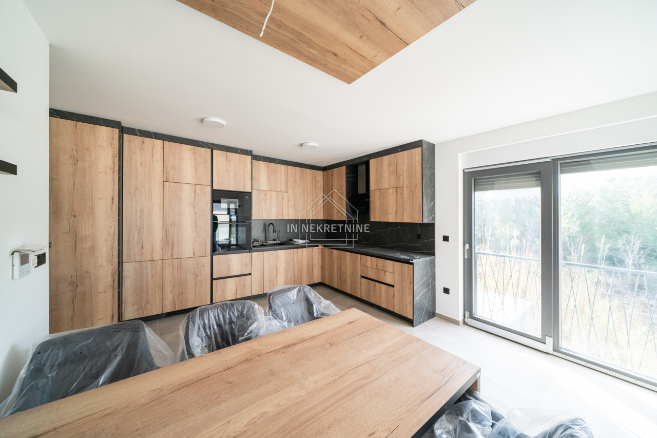 Stan se sastoji od ulaznog prostora, hodnika, dvije spavaće sobe (jedna s vlastitom kupaonicom), dodatne kupaonice te prostrane kuhinje, blagovaonice i dnevnog boravka u open space konceptu s izlazom na natkrivenu terasu, te krovne terase s bazenom.