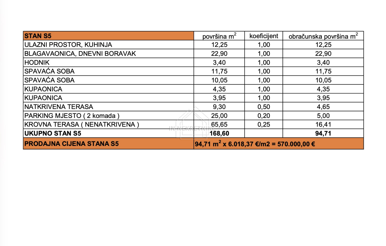 Bruto površina iznosi 168,60 m², dok neto prodajna površina iznosi 94,71 m².