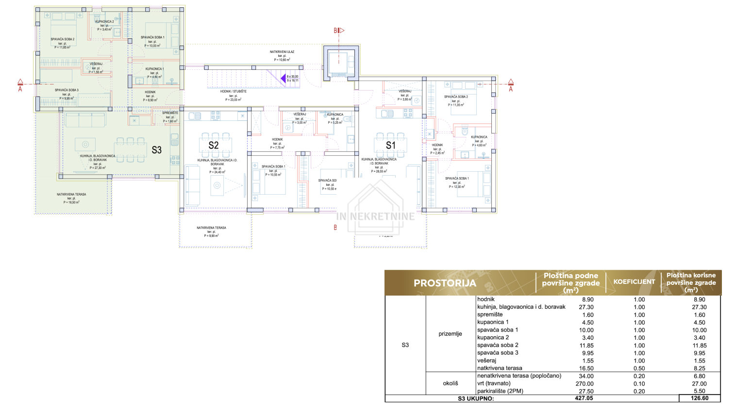 Stan je funkcionalnog rasporeda te se sastoji od ulaznog hodnika, vešeraja, spremišta, tri spavaće sobe (od kojih jedna ima vlastitu kupaonicu), dodatne kupaonice te prostranog dnevnog dijela, kuhinje, blagovaonice i dnevnog boravka po open space konceptu. Iz dnevnog boravka omogućen je izlaz na natkrivenu terasu.