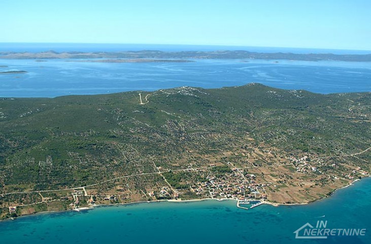 Građevinsko zemljište, izgrađeni dio, površine 1423 m2, dimenzija cca 34x44 m. Nalazi se uz glavnu prometnicu i 300 m od mora. Tražena cijena je 100 Eur/m2.