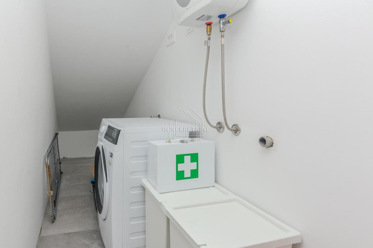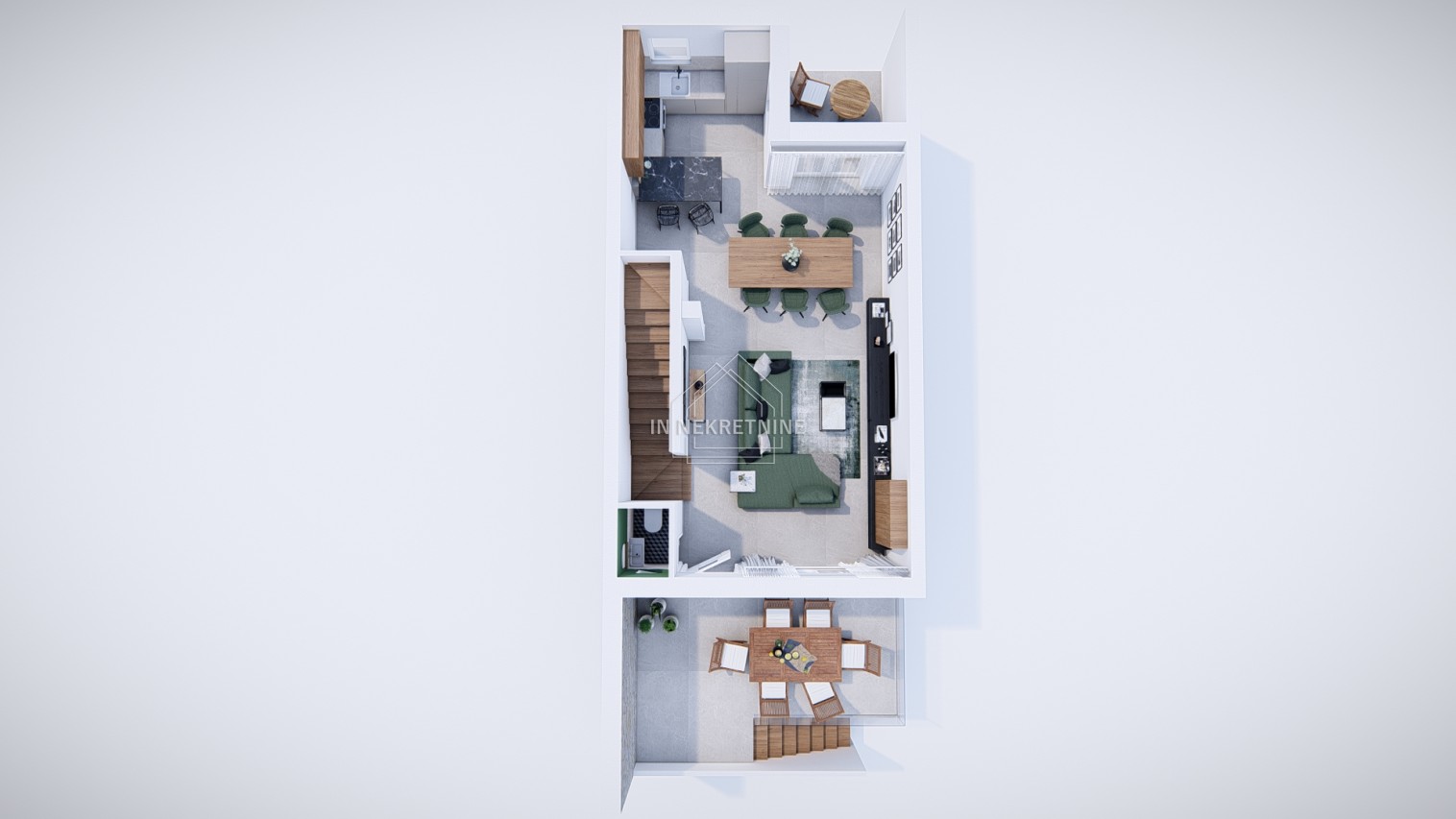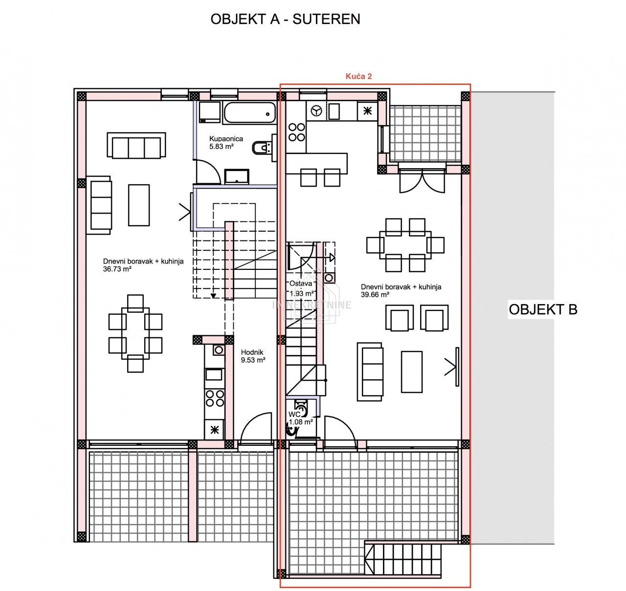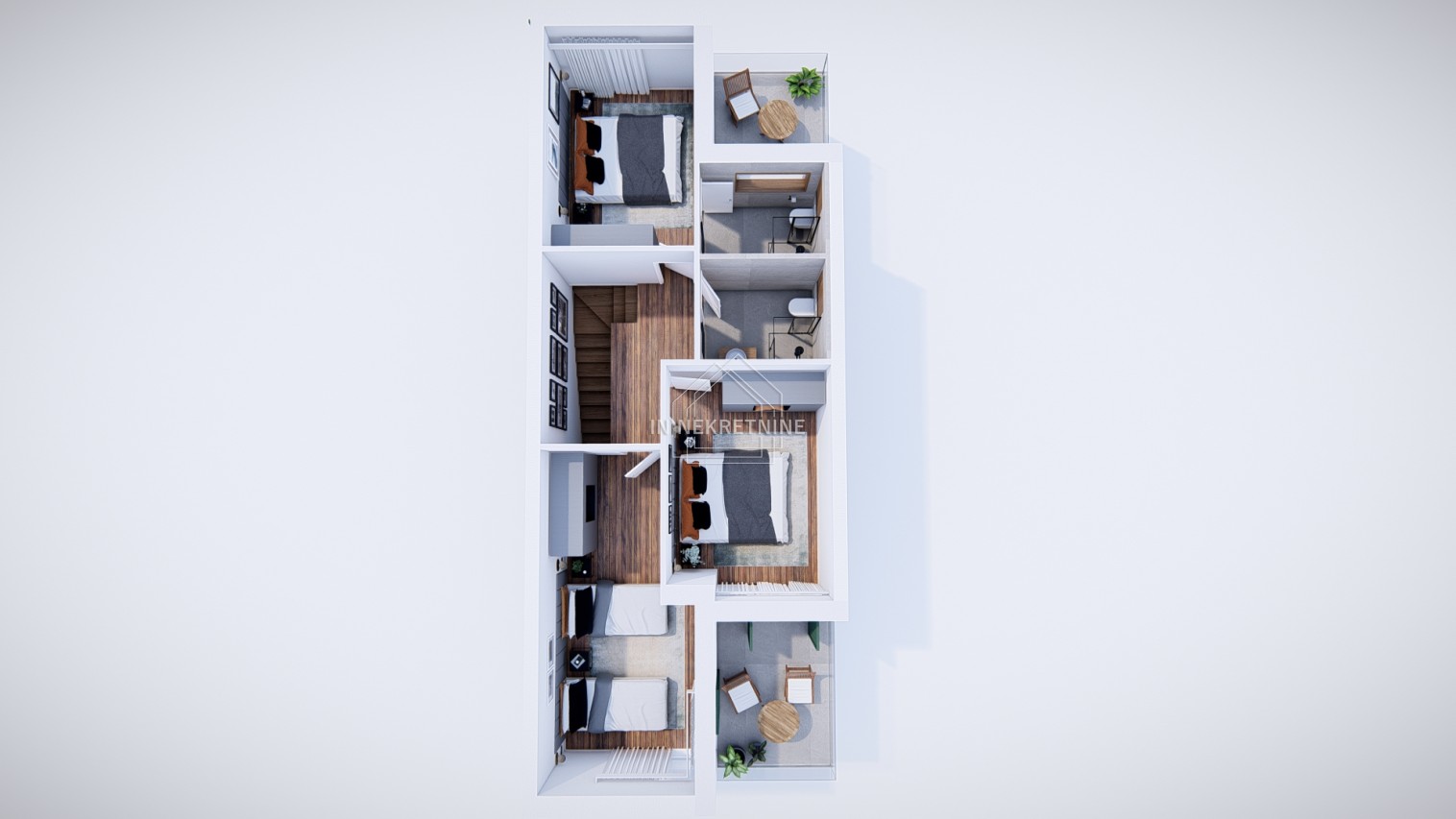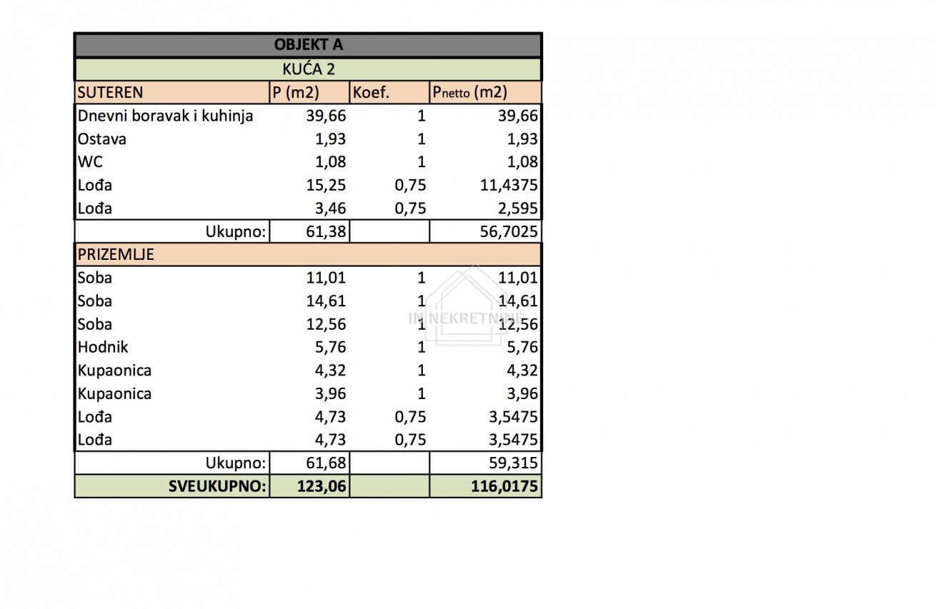 Kuća 2 površine 116,02 m2 - prostire se na dvije etaže. Na donjoj etaži se nalaze dnevni boravak i kuhinja iz kojih se izlazi na lođu, ostava i wc, a na gornjoj etaži se nalaze tri spavaće sobe (jedna od njih je master soba sa vlastitom kupaonicom i izlazom na lođu), hodnik, kupaonica i lođa. Detaljne kvadrature i tlocrt možete vidjeti na priloženim fotografijama (Objekt A, Kuća 2). Kuća se prodaje kompletno namještena i opremljena. Tražena cijena je 400.000,00 EUR.