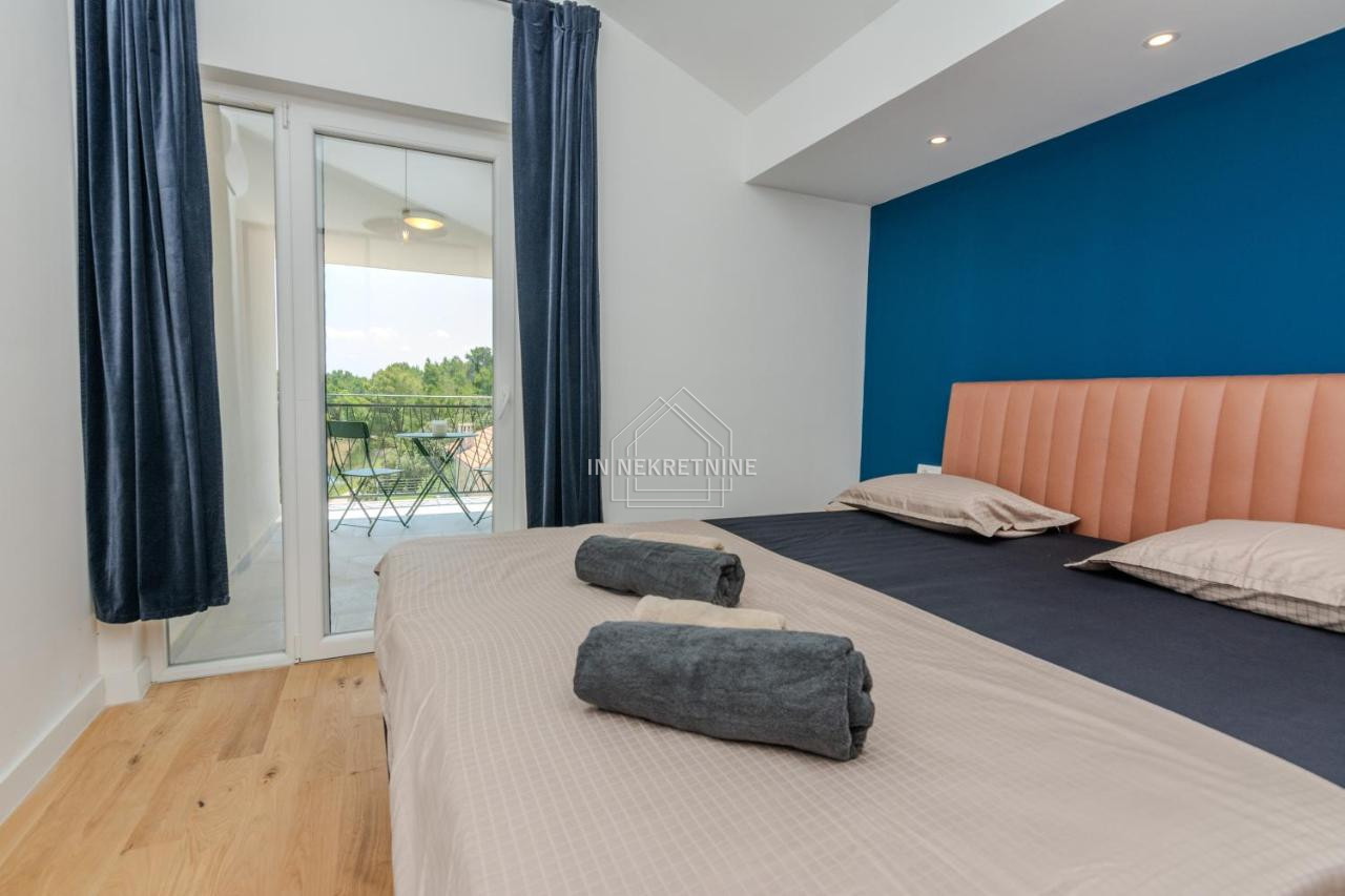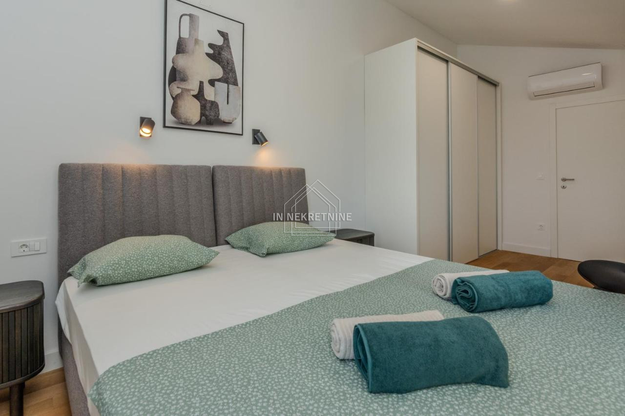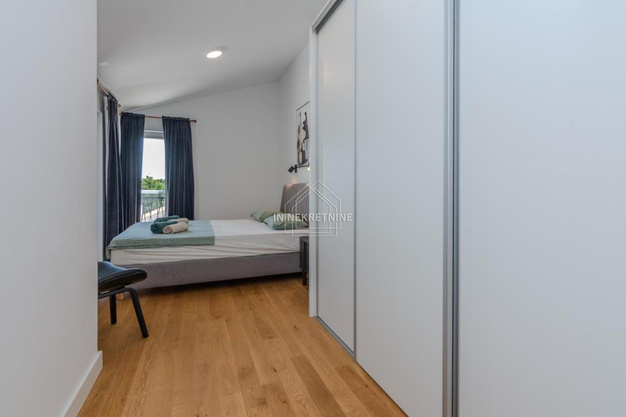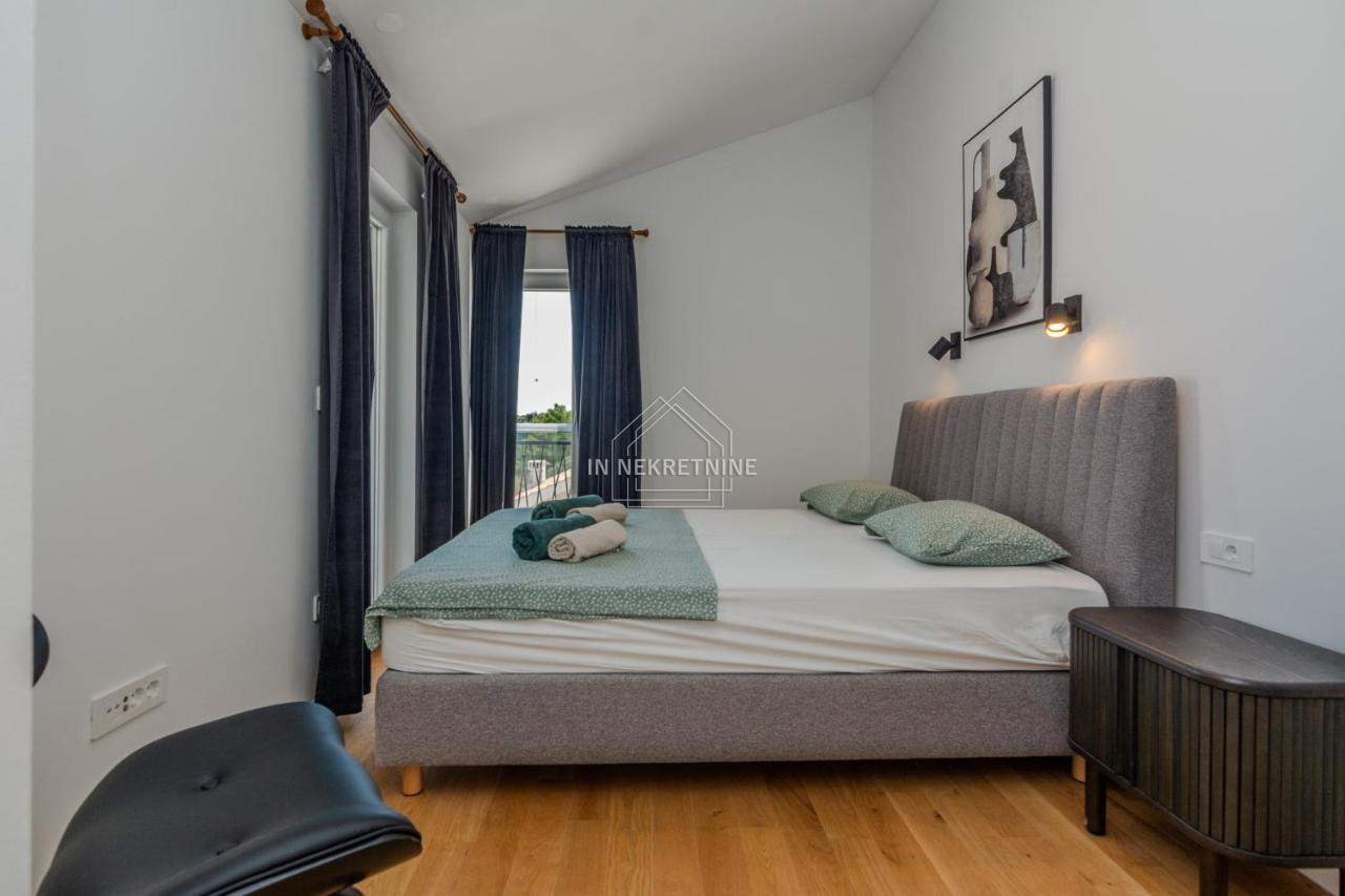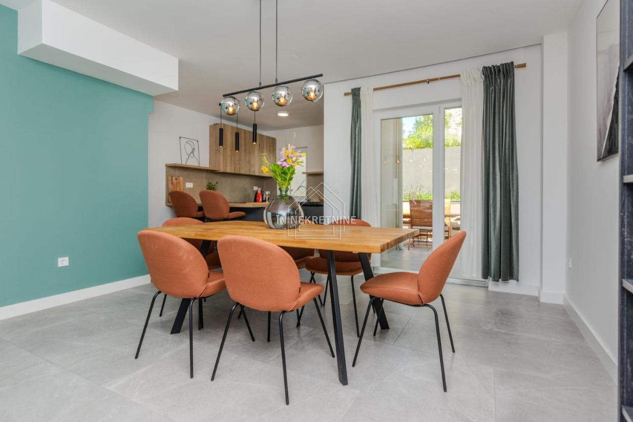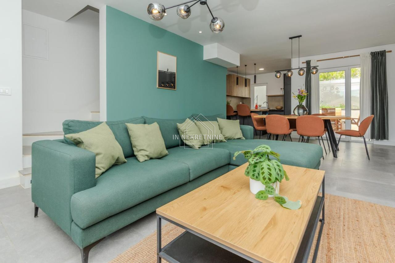 Kuća 2 površine 116,02 m2 - prostire se na dvije etaže. Na donjoj etaži se nalaze dnevni boravak i kuhinja iz kojih se izlazi na lođu, ostava i wc, a na gornjoj etaži se nalaze tri spavaće sobe (jedna od njih je master soba sa vlastitom kupaonicom i izlazom na lođu), hodnik, kupaonica i lođa. Detaljne kvadrature i tlocrt možete vidjeti na priloženim fotografijama (Objekt A, Kuća 2). Kuća se prodaje kompletno namještena i opremljena. Tražena cijena je 400.000,00 EUR.