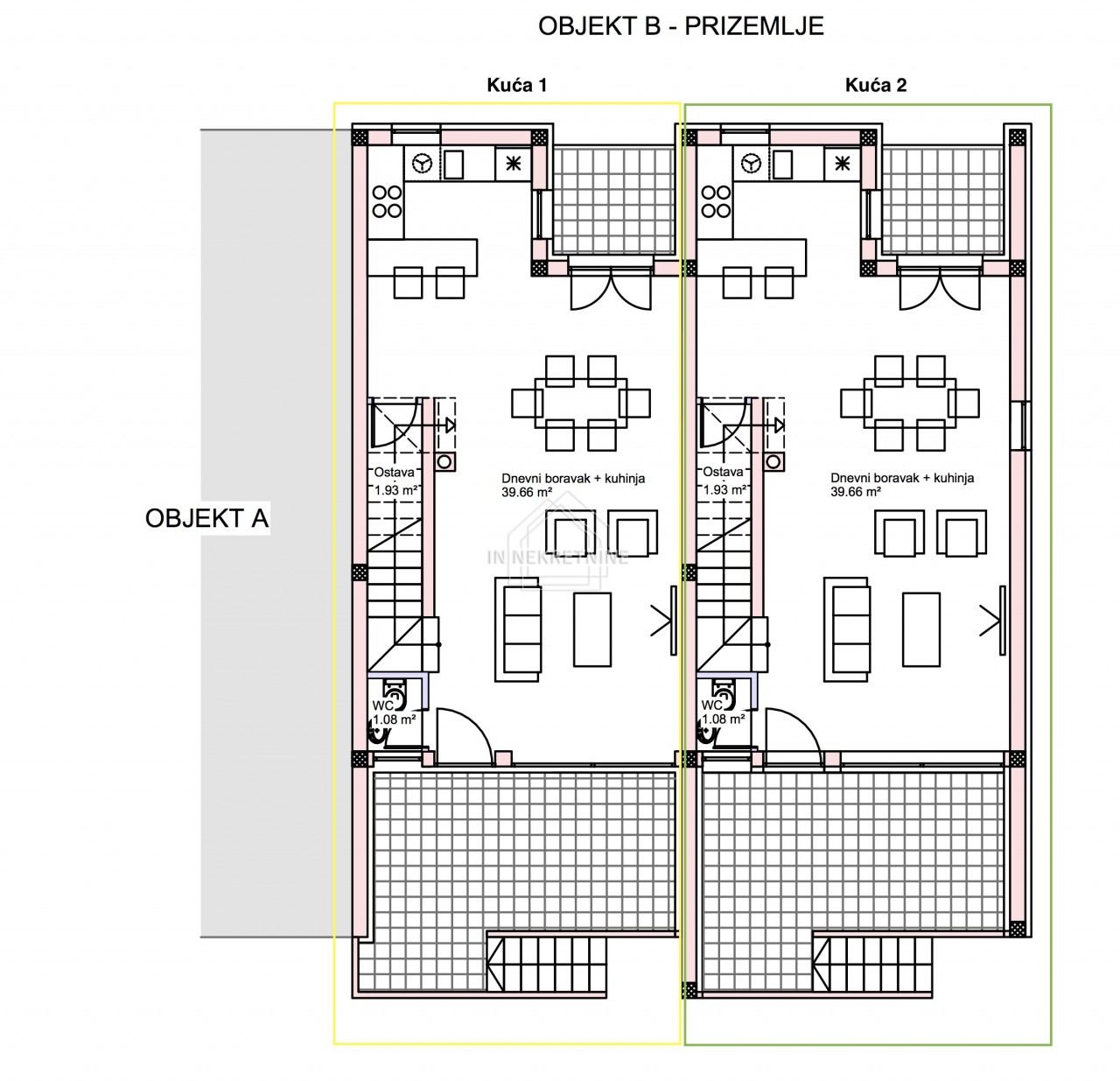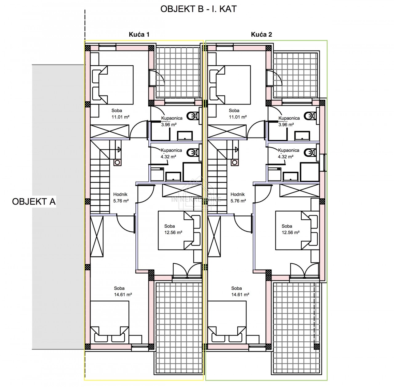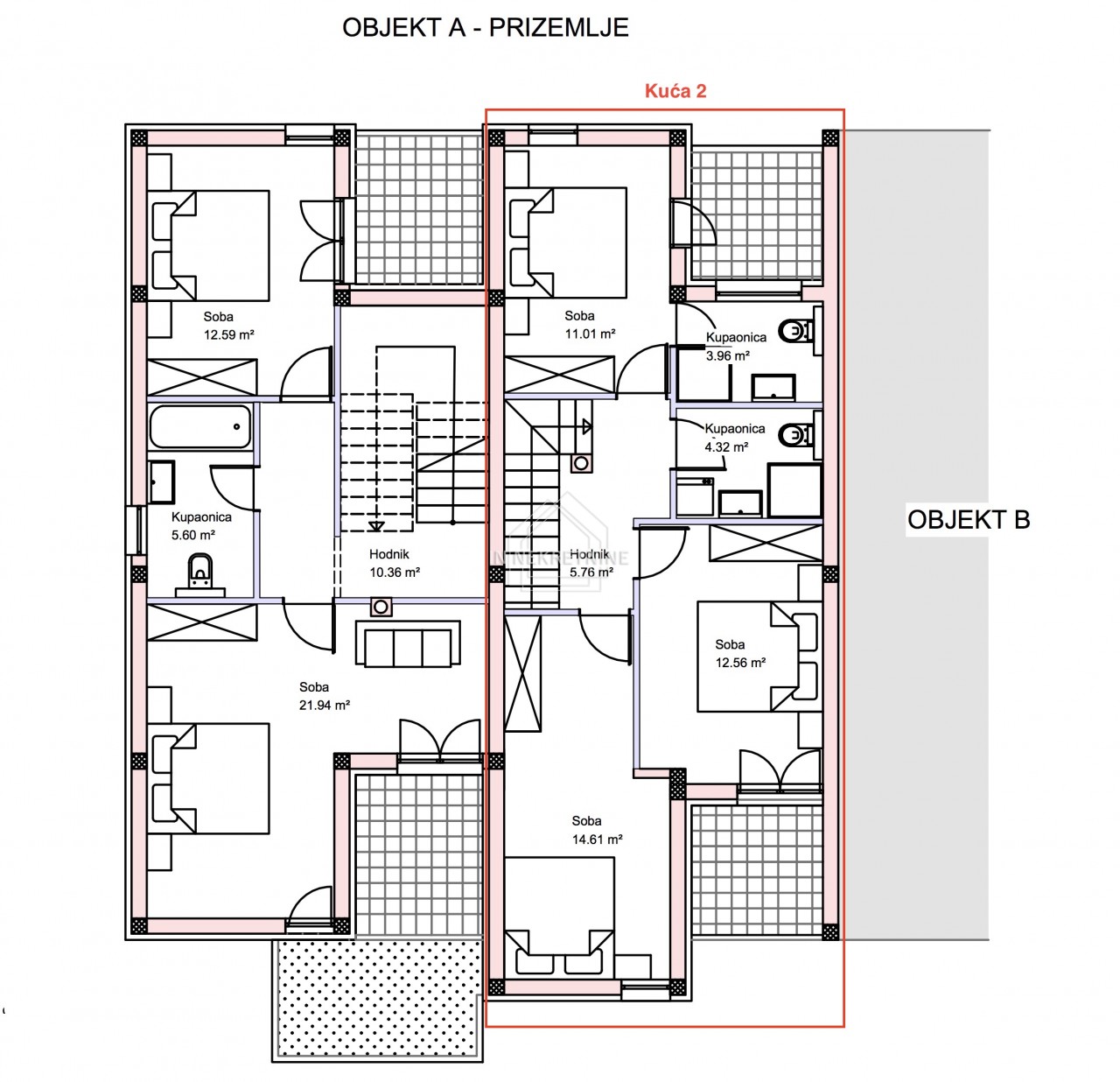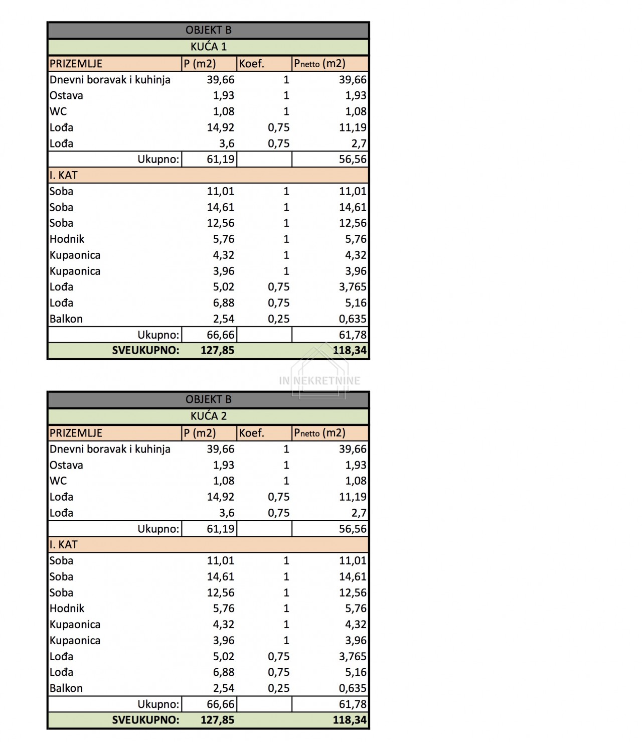 Kuća 1 površine 118,34 m2 - prostire se na dvije etaže. Na donjoj etaži se nalaze dnevni boravak i kuhinja iz kojih se izlazi na lođu, ostava i wc, a na gornjoj etaži se nalaze tri spavaće sobe (jedna od njih je master soba sa vlastitom kupaonicom i izlazom na lođu), hodnik, kupaonica i lođa. Detaljne kvadrature i tlocrt možete vidjeti na priloženim fotografijama (Objekt B, Kuća 1). Tražena cijena je 400.000,00 EUR.