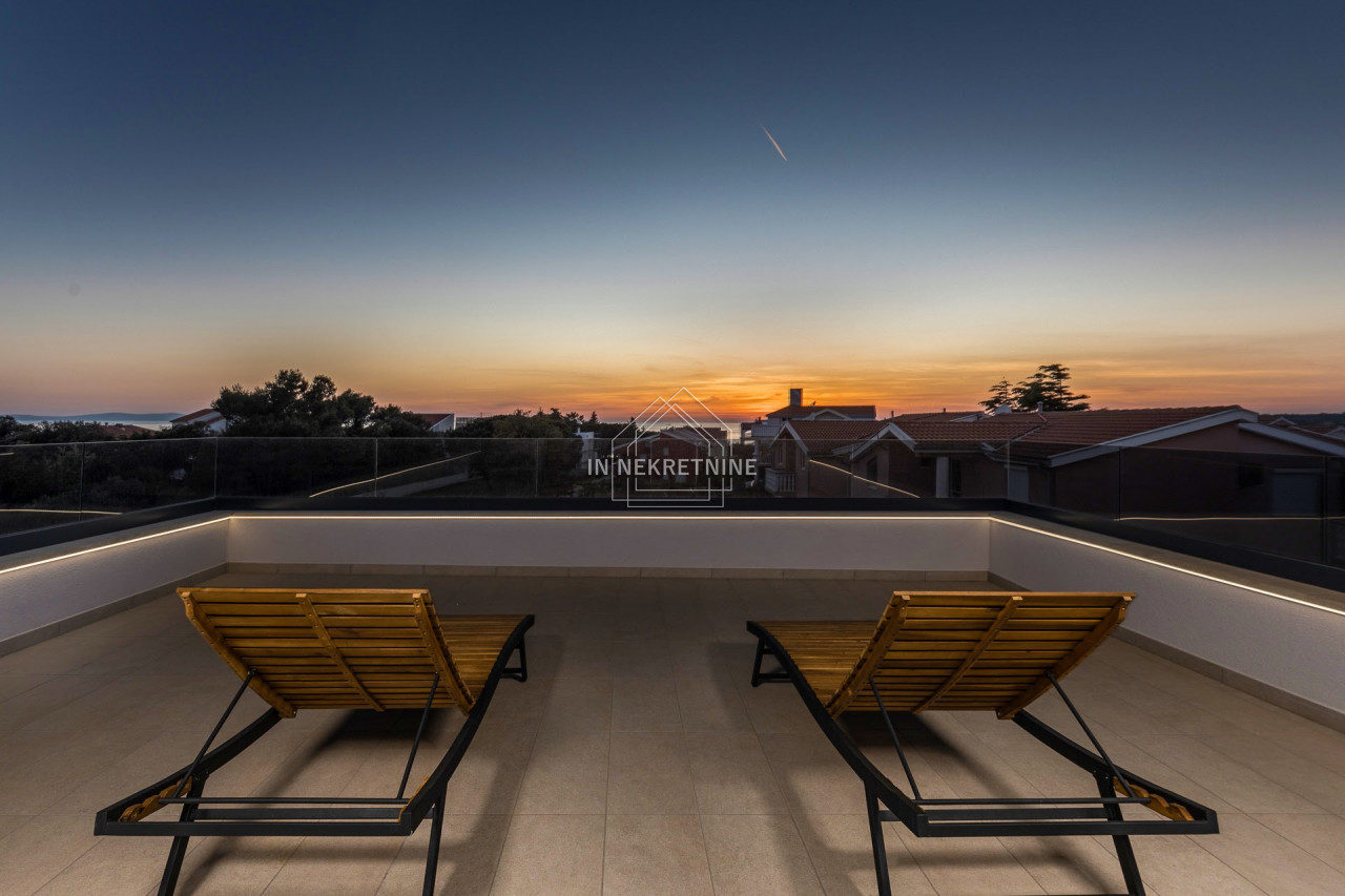 Na prodaju je novoizgrađena moderna vila ukupne bruto površine 386 m², smještena na parceli od 466 m², na izuzetnoj lokaciji, samo 150 metara od mora i predivne plaže. Vila se prostire na tri etaže: prizemlje, prvi kat i krovnu terasu.