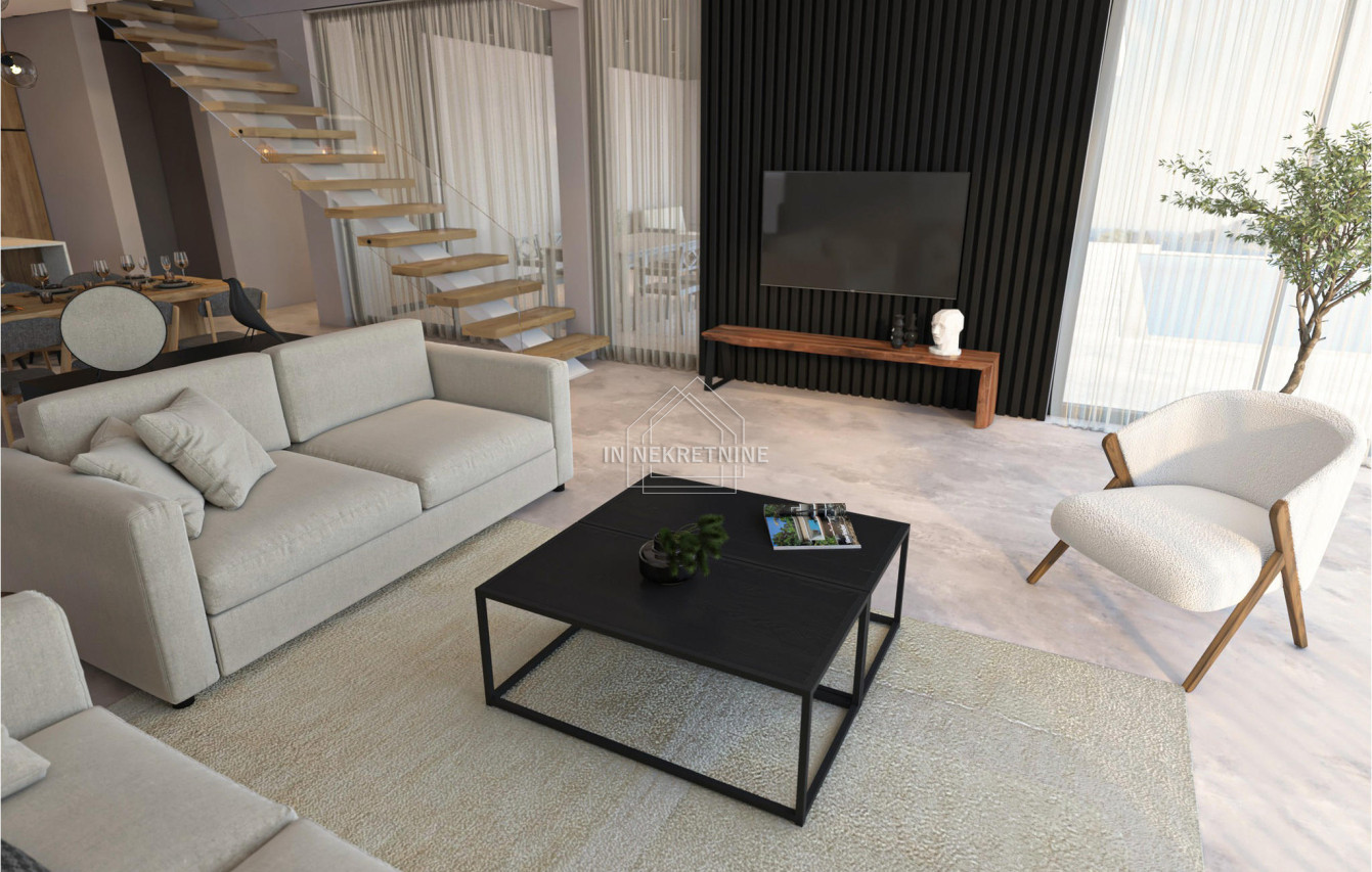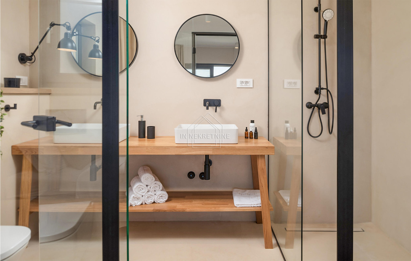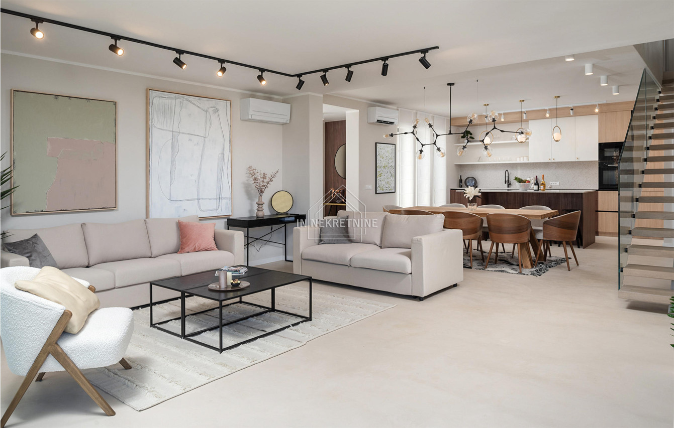- Podovi: mikrocement u dnevnim prostorijama, prvoklasni hrastov parket u spavaćim sobama