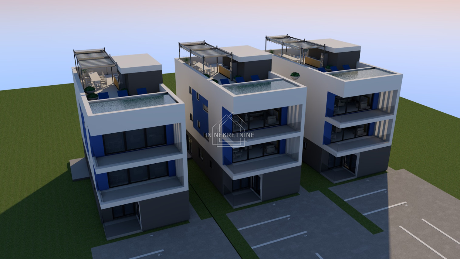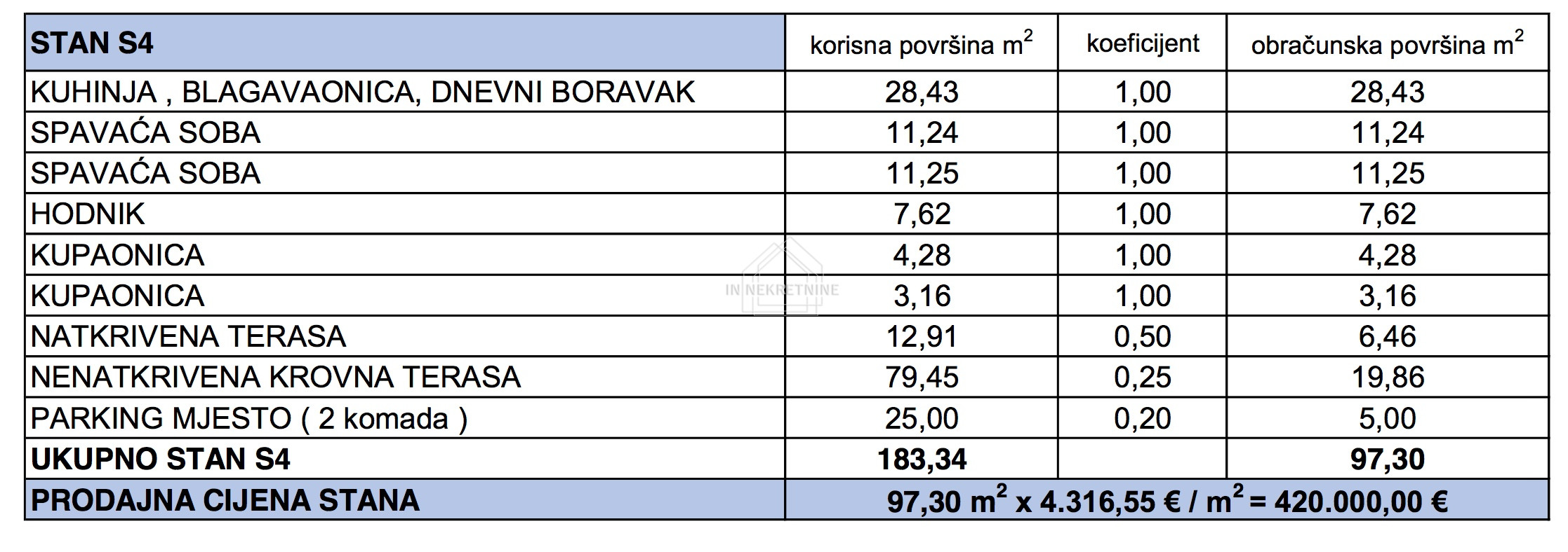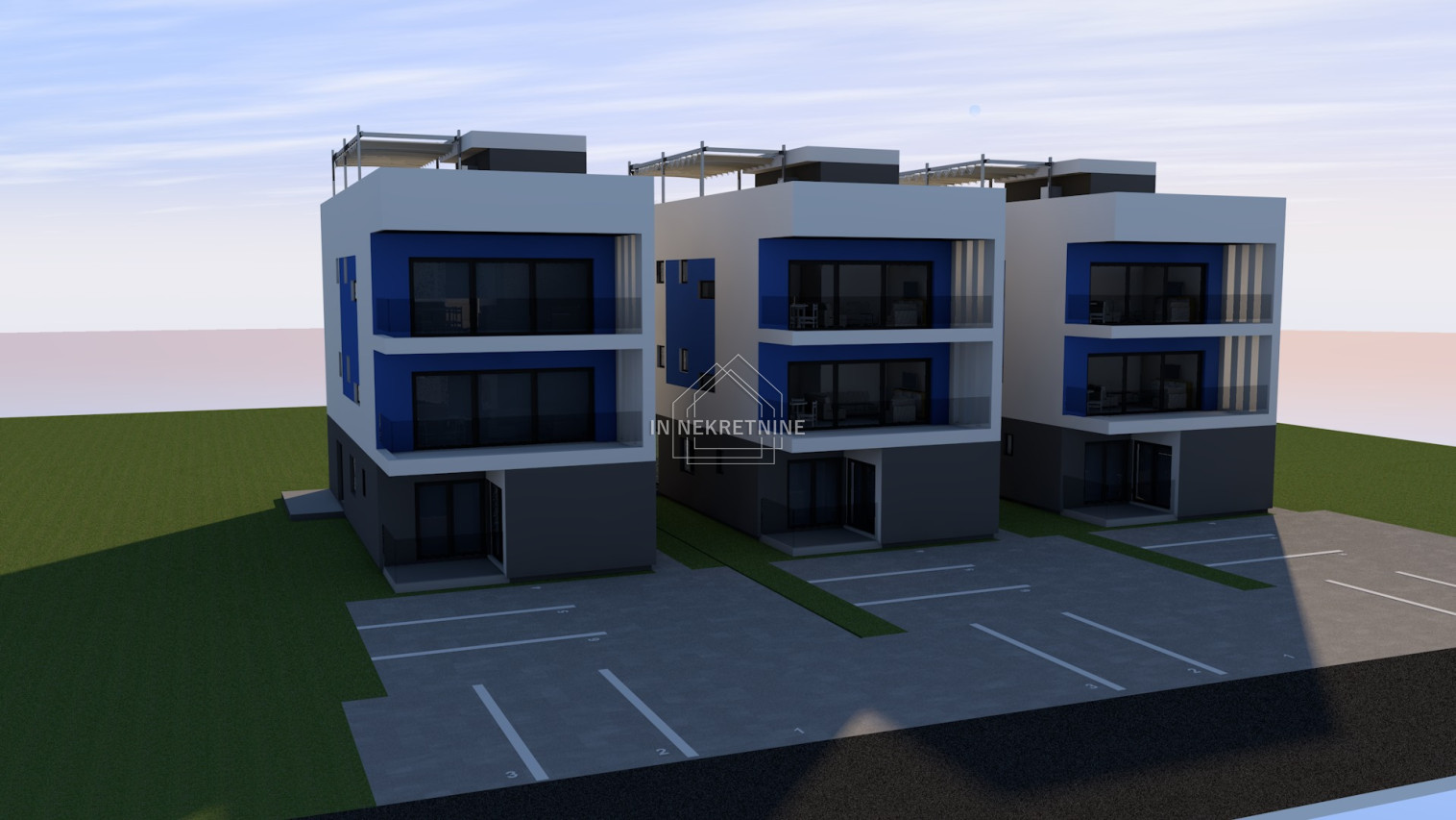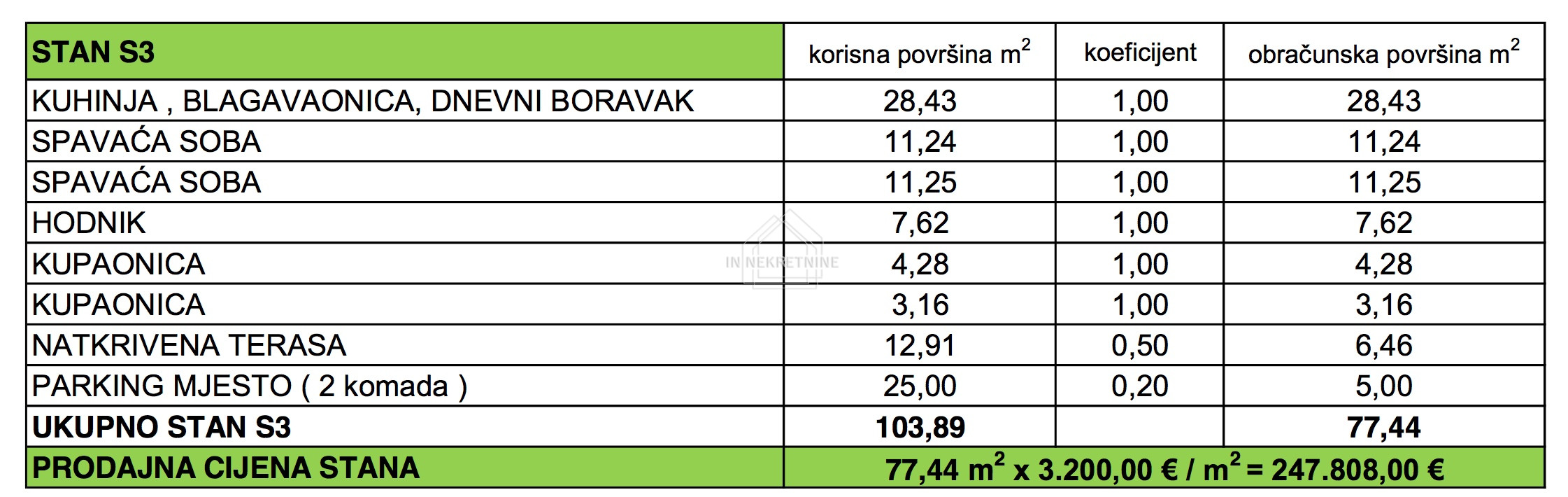 S3 - 77,44 m2 sastoji se od kuhinje, blagovaonice, dnevnog boravka, dvije kupaonice, dvije spavaće sobe i natkrivene terase. Pripadaju mu dva parkirna mjesta. CIJENA 247.808 EURA