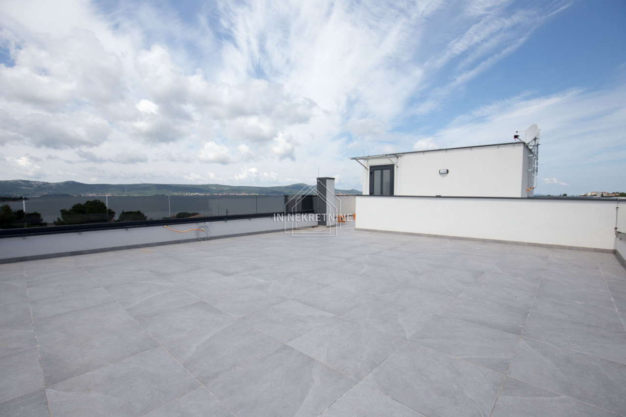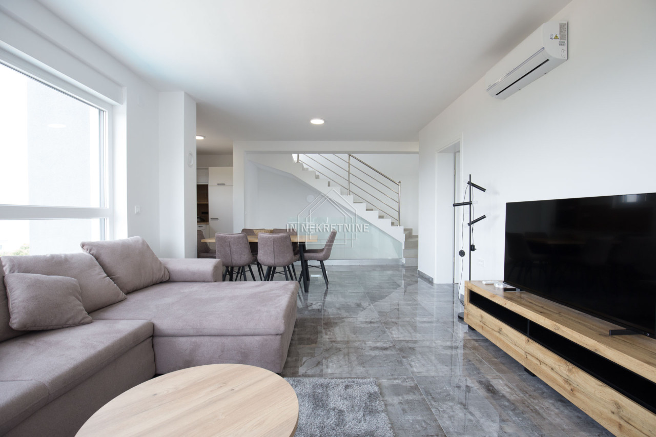 STAN 1 - 112,24 m2 sastoji se od kuhinje, blagovaonice, dnevnog boravka, kupaonice, tri spavaće sobe, natkrivene terase i krovne terase ( 78 m2 obračunata po koeficijentu 0,25). Stanu pripada spremište u podrumu zgrade i vanjsko parkirno mjesto. Prodaje se kompletno namješten. CIJENA - 448.960,00 EUR.