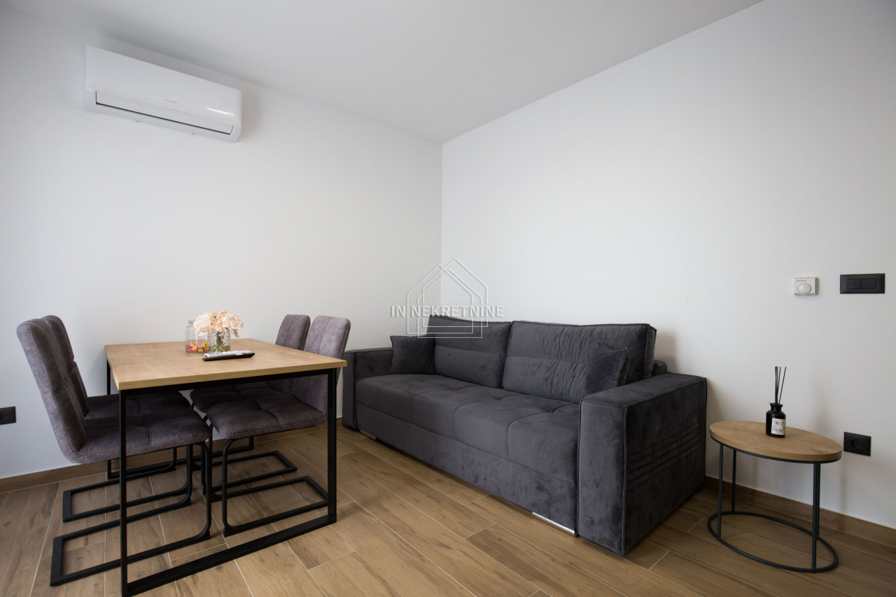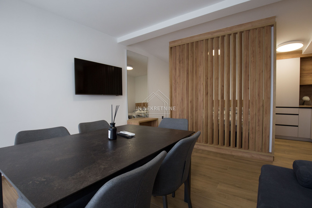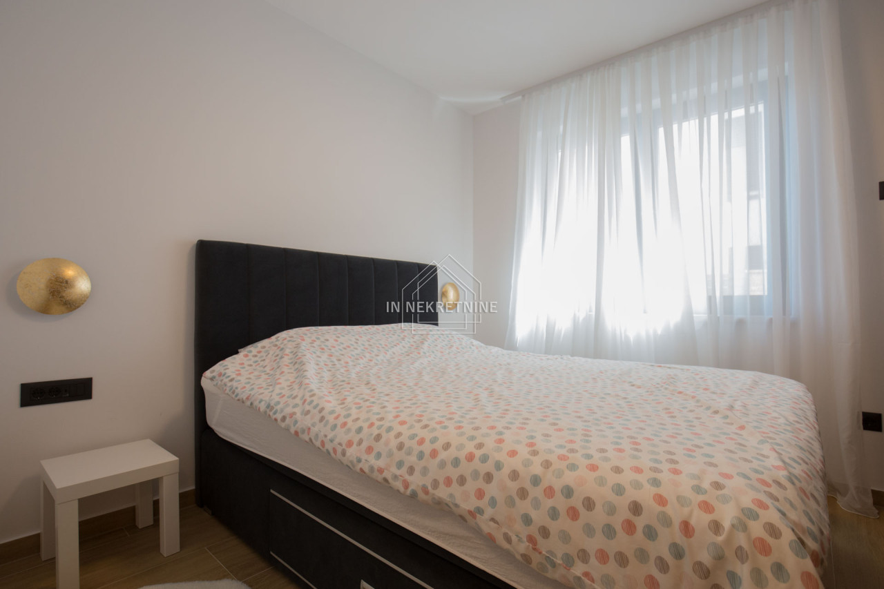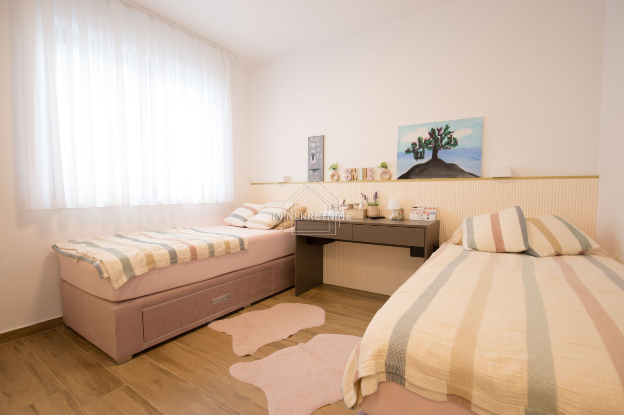 Stan površine 144 m2 nalazi se u prizemlju novoizgrađene apartmanske zgrade. U naravi je podjeljen je u tri stambene jedinice i wellnes. Stan 1 je površine 64 m2 ( ima dvije spavaće sobe), stan 2 je površine 36 m2 (jedna spavaća soba), stan 3 je površine 24 m2 (garsonijera) i wellness je površine 20 m2. Pripada mu cijelo dvorište površine 145 m2.