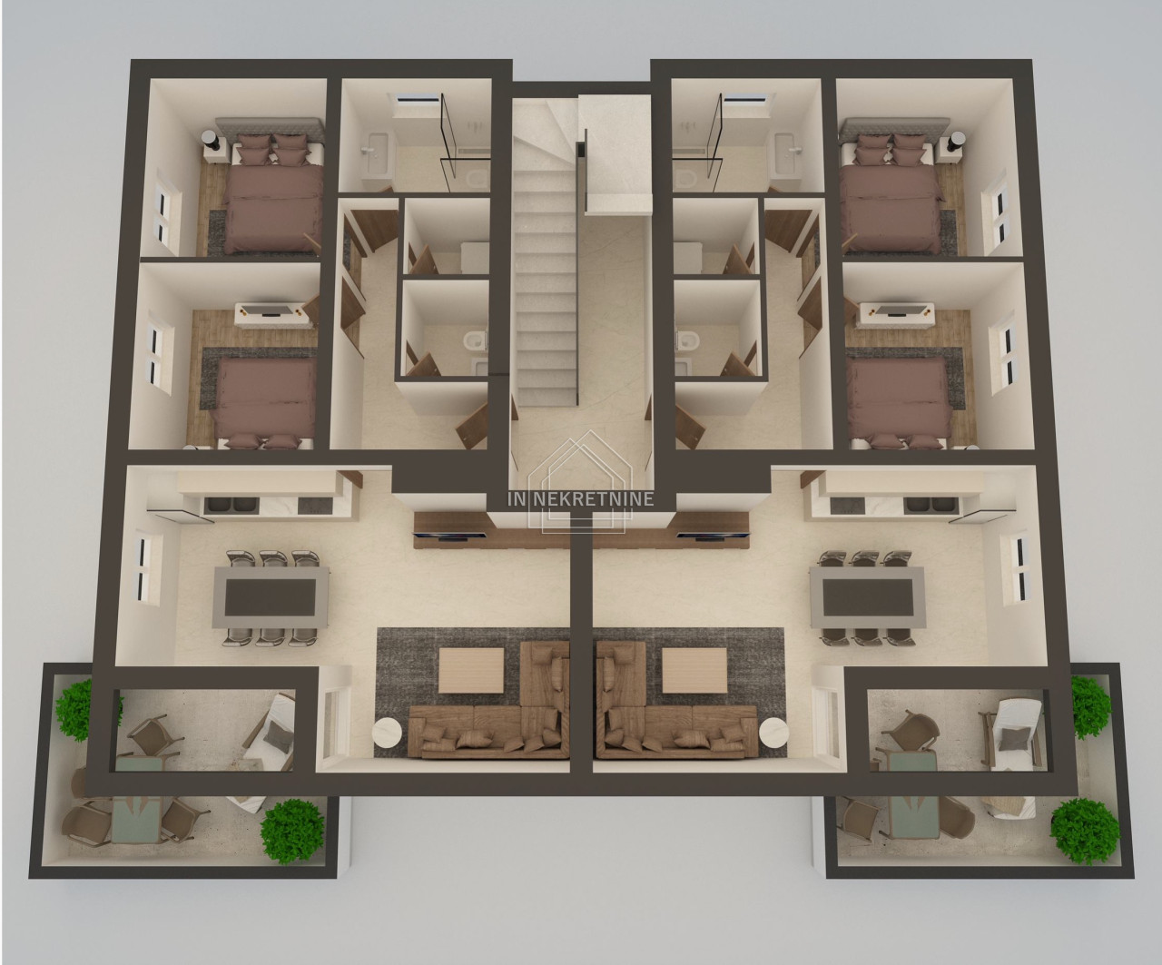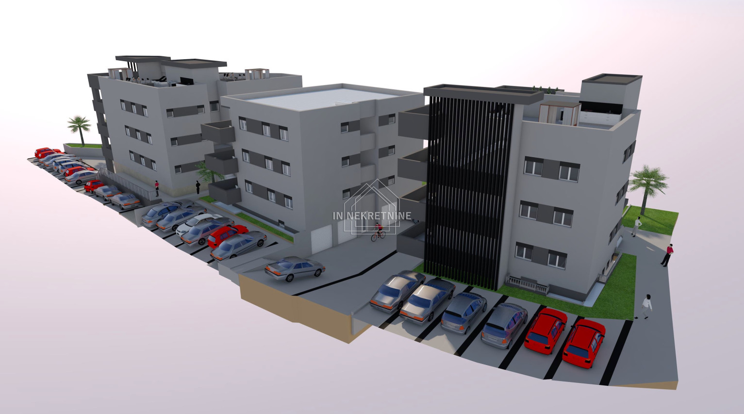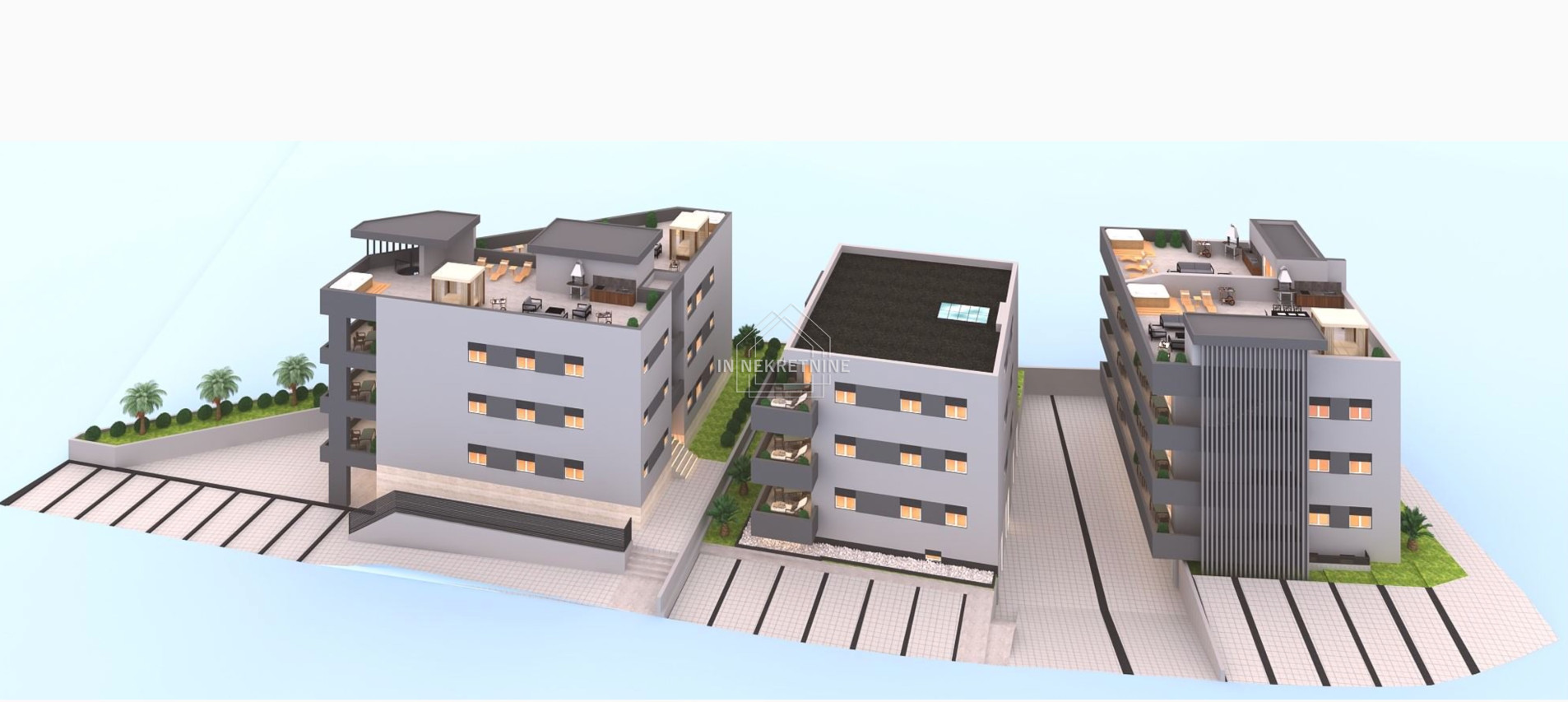STAN S5- 86,51 m2 ( PENTHOUSE) Sastoji se od kuhinje, blagovaonice, dnevnog boravka, kupaonice, spavaće sobe, natkrivene terase i krovne terase. Pripada mu vanjsko parkirno mjesto. Cijena: 276.832,00 EUR.