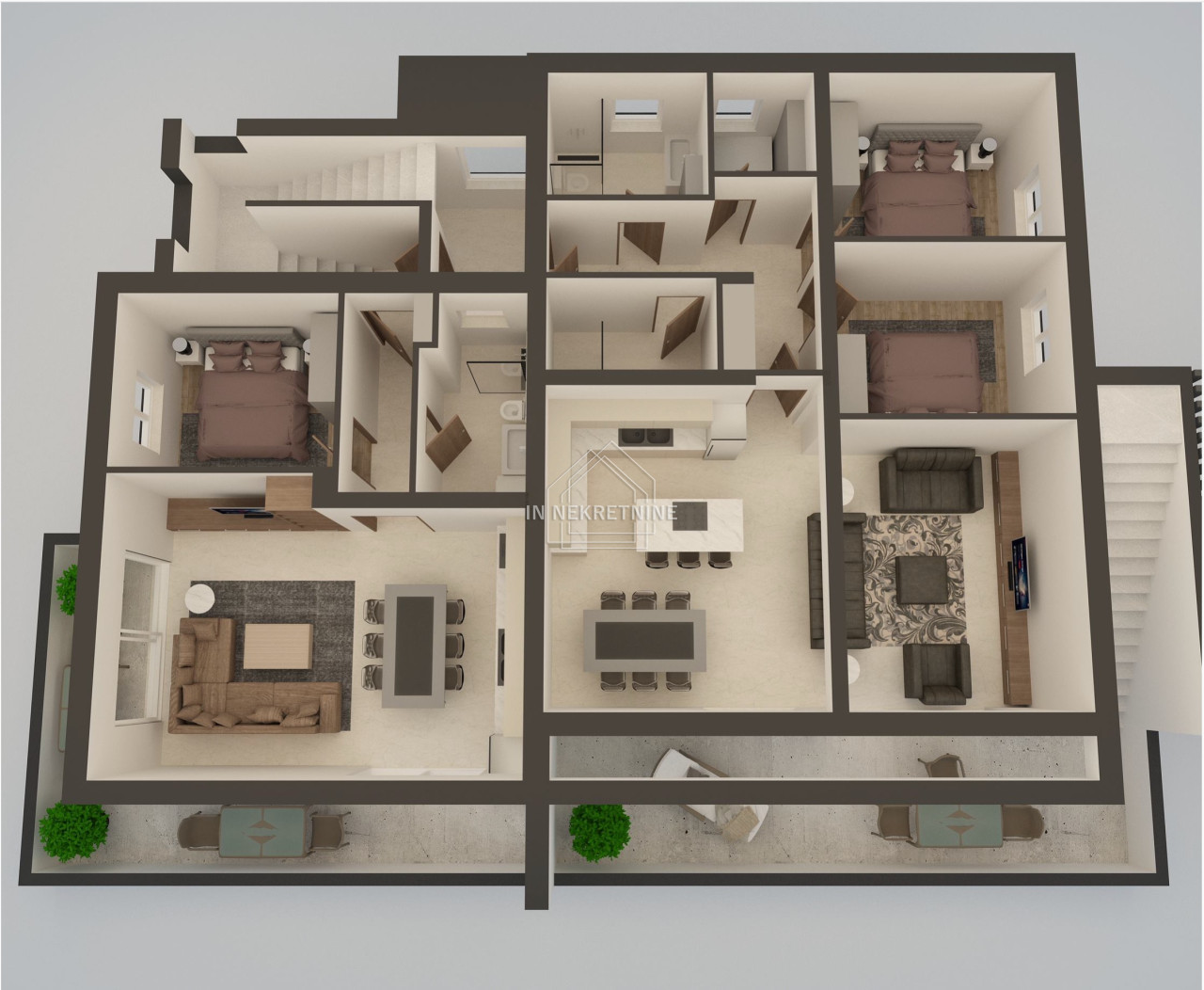 S6-132,3 m2 ( 2.KAT - PENTHOUSE) sastoji se od kuhinje, blagovaonice, dnevnog boravka, dvije kupaonice, wc-a, tri spavaće sobe, praonice, natkrivene terase i krovne terase. Pripada mu vanjsko parkirno mjesto. Cijena- 423.272,00 EUR