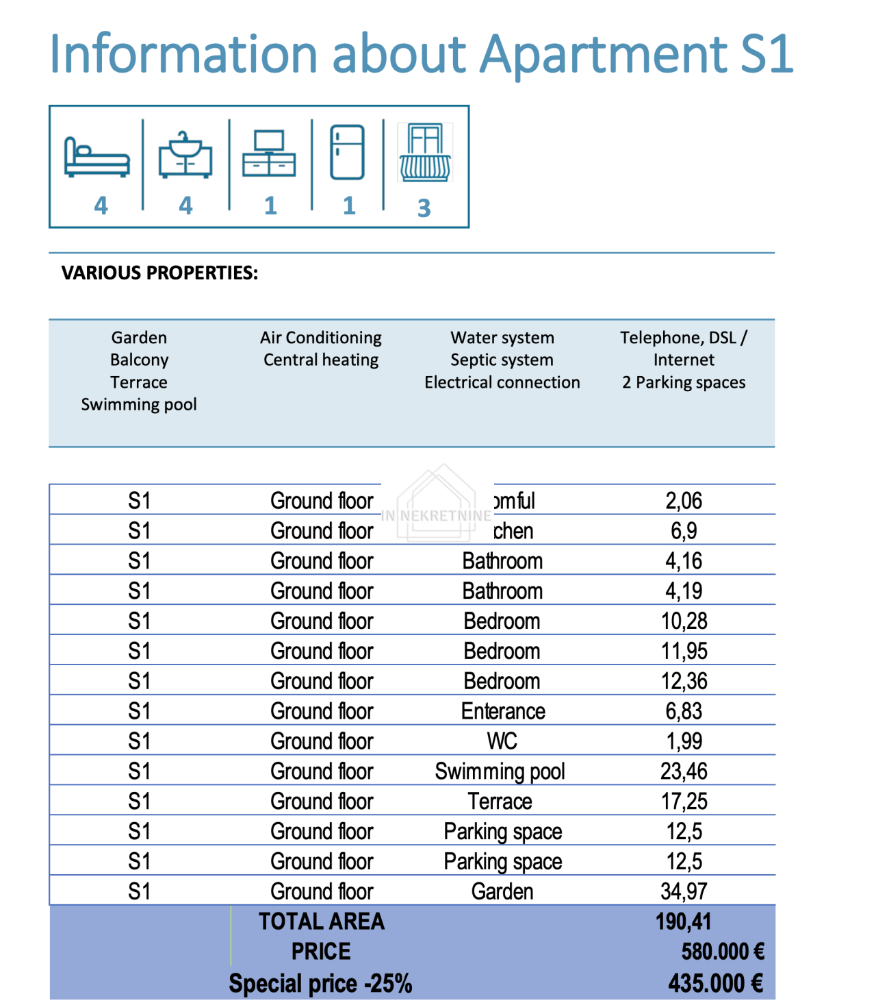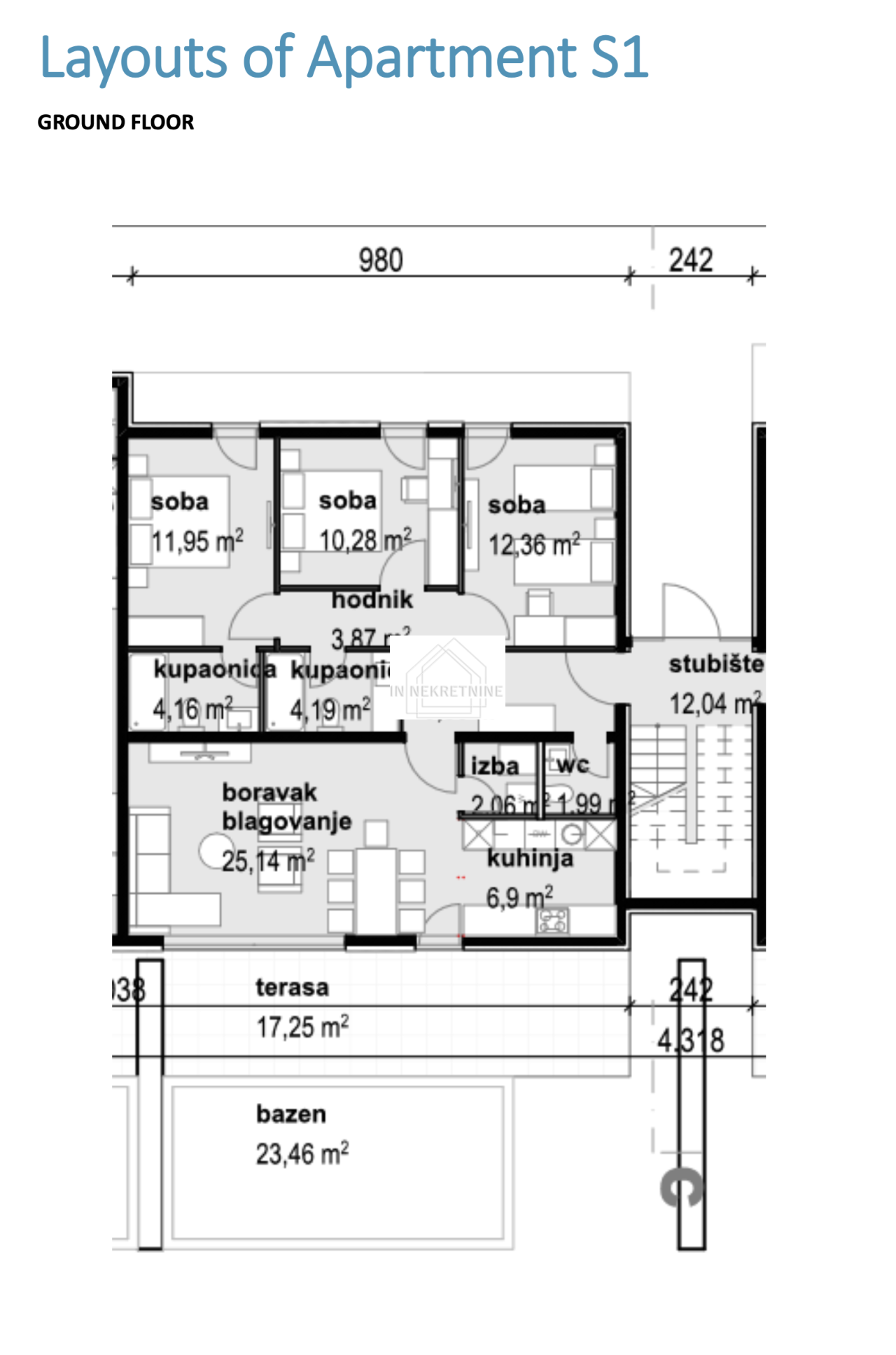 S1 - 190,41 m2 Sastoji se od kuhinje, blagovaonice, dnevnog boravka, dvije kupaonice, wc-a, tri spavaće sobe, ostave, terase i vanjskog bazena. Stanu pripadaju dva vanjska parkirna mjesta. CIJENA - 435.000,00 EURA.