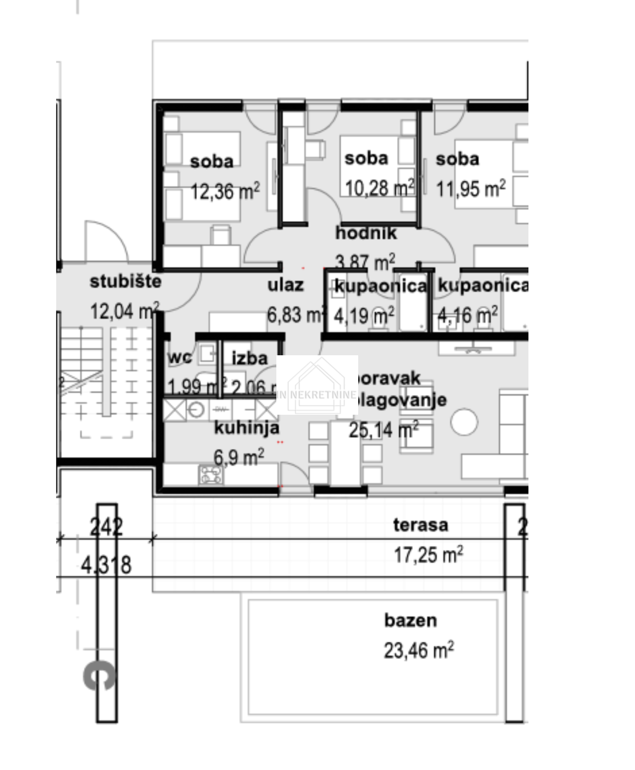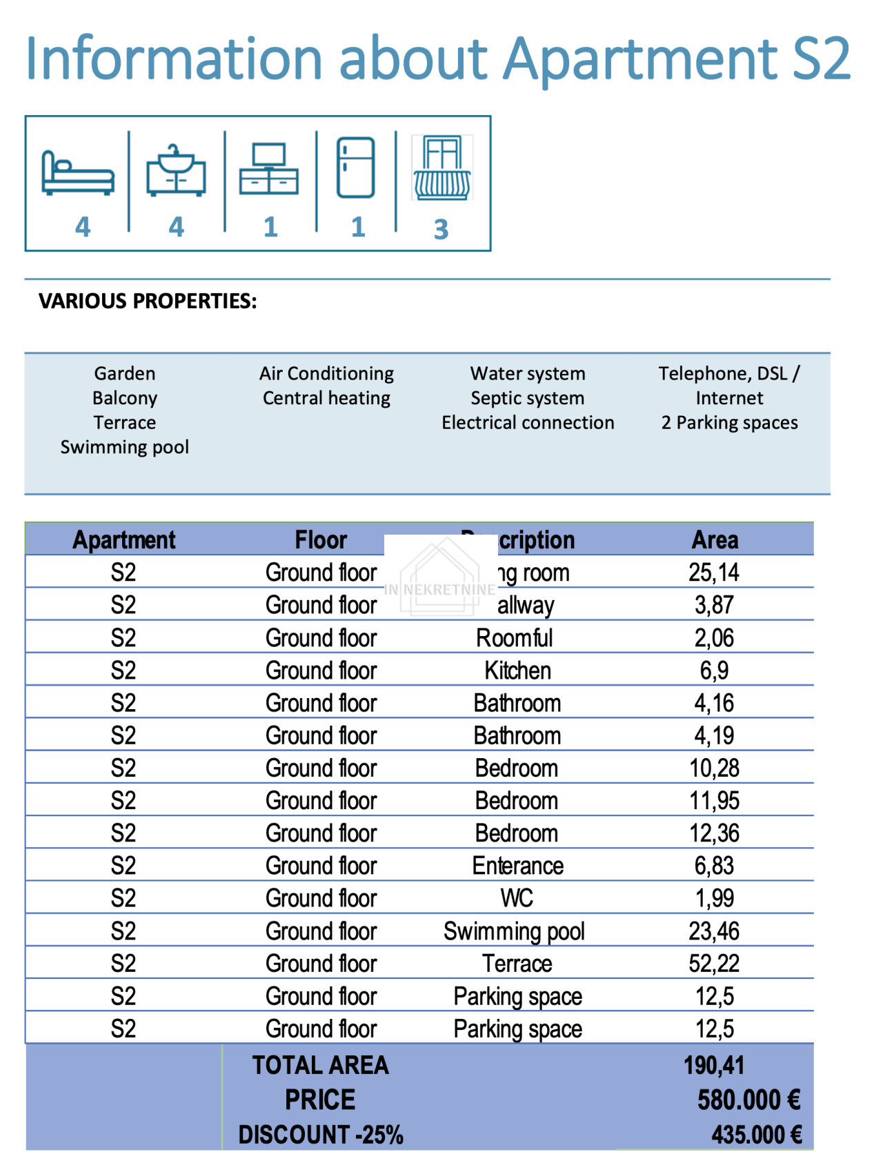 S2 - 190,41 m2 Sastoji se od kuhinje, blagovaonice, dnevnog boravka, dvije kupaonice, wc-a, tri spavaće sobe, ostave, terase i vanjskog bazena . Stanu pripadaju dva vanjska parkirna mjesta. CIJENA - 435.000,00 EURA.