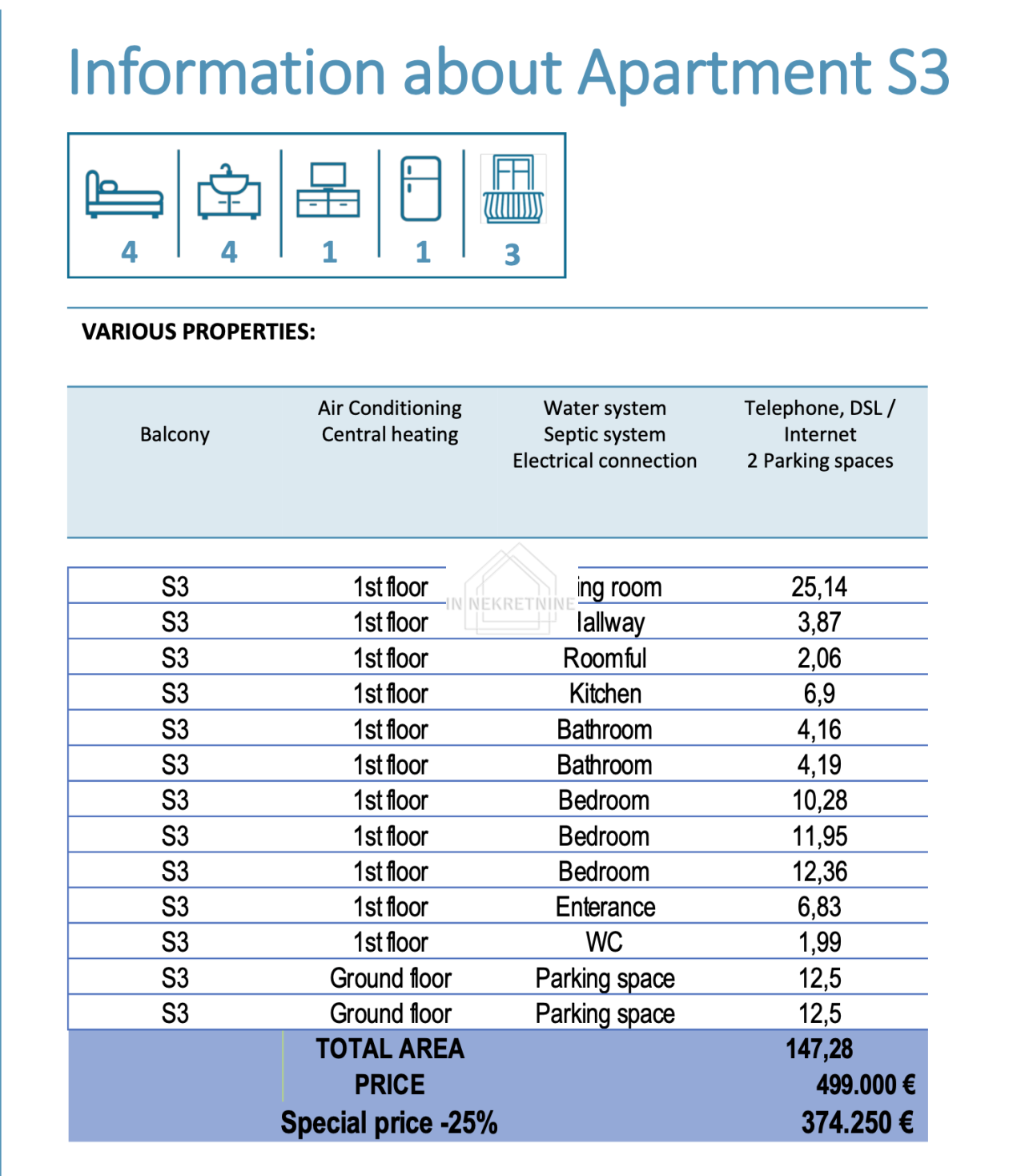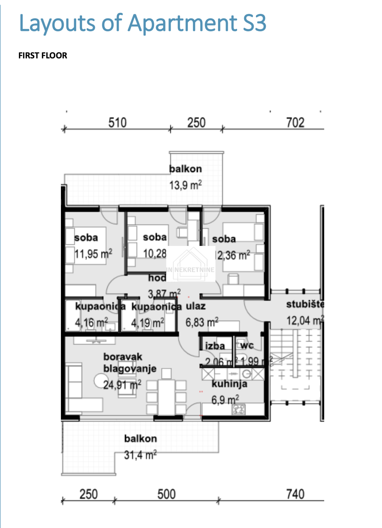 S3 - 147,28 m2 Sastoji se od kuhinje, blagovaonice, dnevnog boravka, dvije kupaonice, wc-a, tri spavaće sobe, ostave i dvije terase. Stanu pripadaju dva vanjska parkirna mjesta. CIJENA - 374.250,00 EURA.