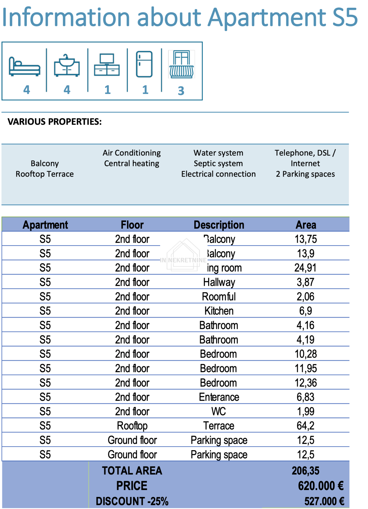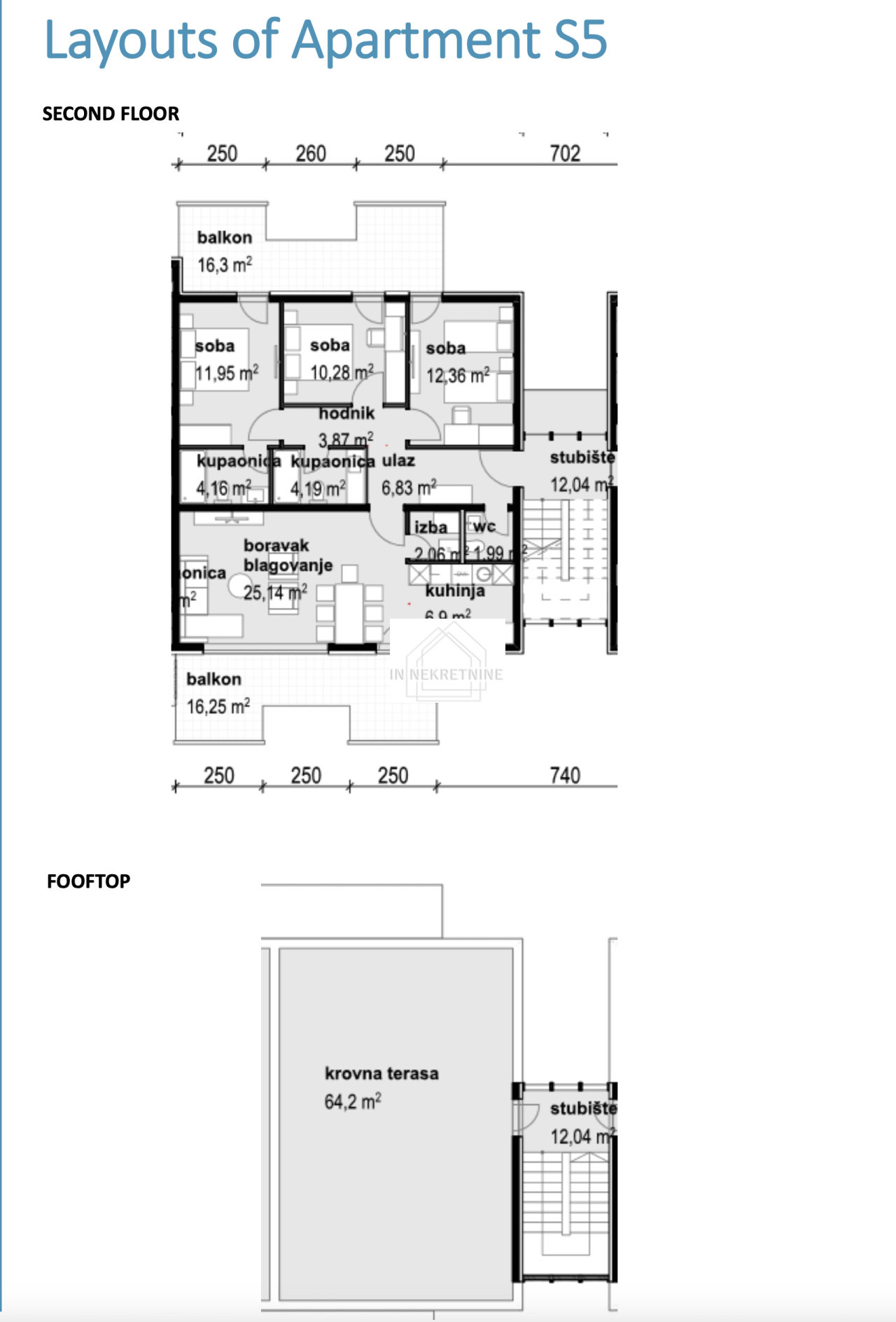 S5 - 206,35 m2 Sastoji se od kuhinje, blagovaonice, dnevnog boravka, dvije kupaonice, wc-a, tri spavaće sobe, ostave, dvije terase i krovne terase. Stanu pripadaju dva vanjska parkirna mjesta. CIJENA - 527.000,00 EURA.