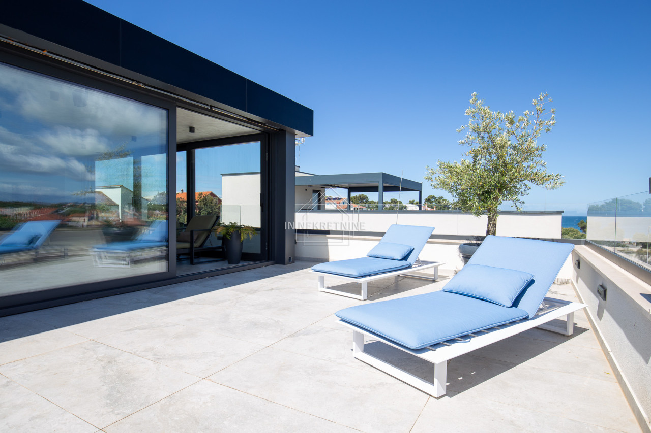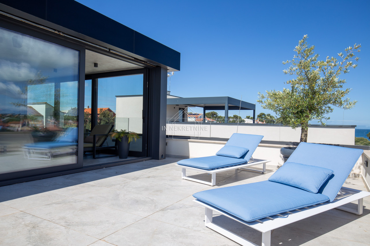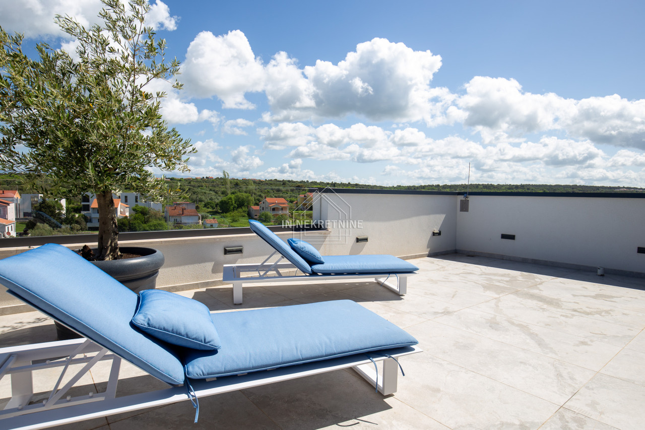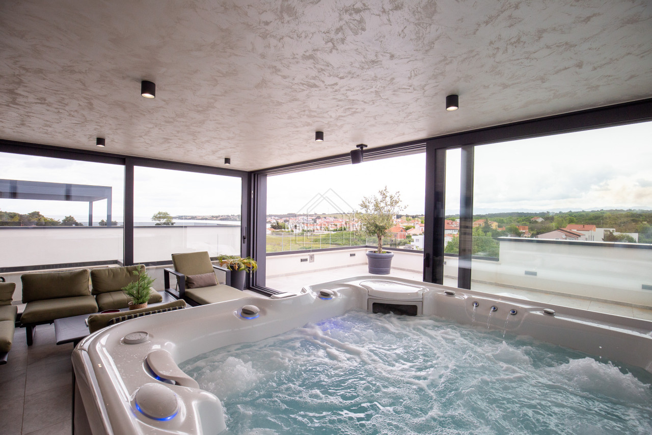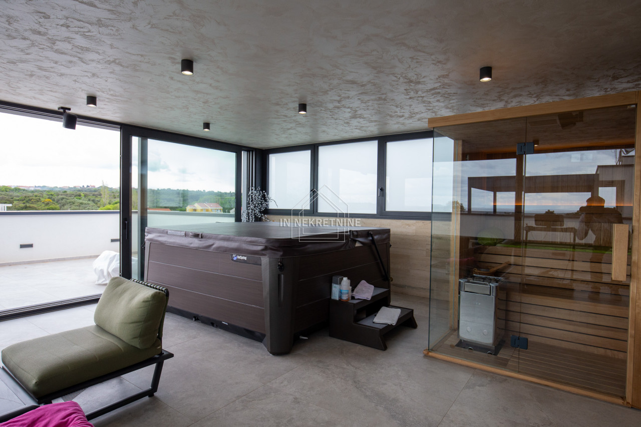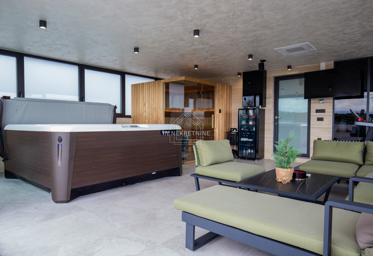 Na krovnoj terasi nalazi se wellness s saunom, jacuzzijem, kupaonicom i prostorom za druženje.