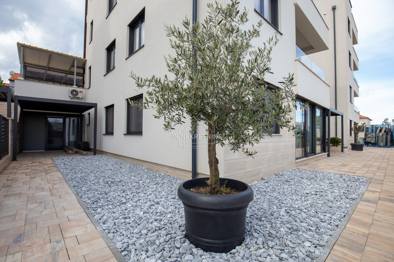 Zgrada se nalazi na izvrsnoj lokaciji, samo 150 metara od mora i prekrasne plaže. U prizemlju se nalaze četiri stambene jedinice: jedan dvosobni stan i tri jednosobna stana (garsonijere). Svi stanovi u prizemlju imaju izlaz na dvorište koje je potpuno uređeno i djelomično natkriveno pergolama.