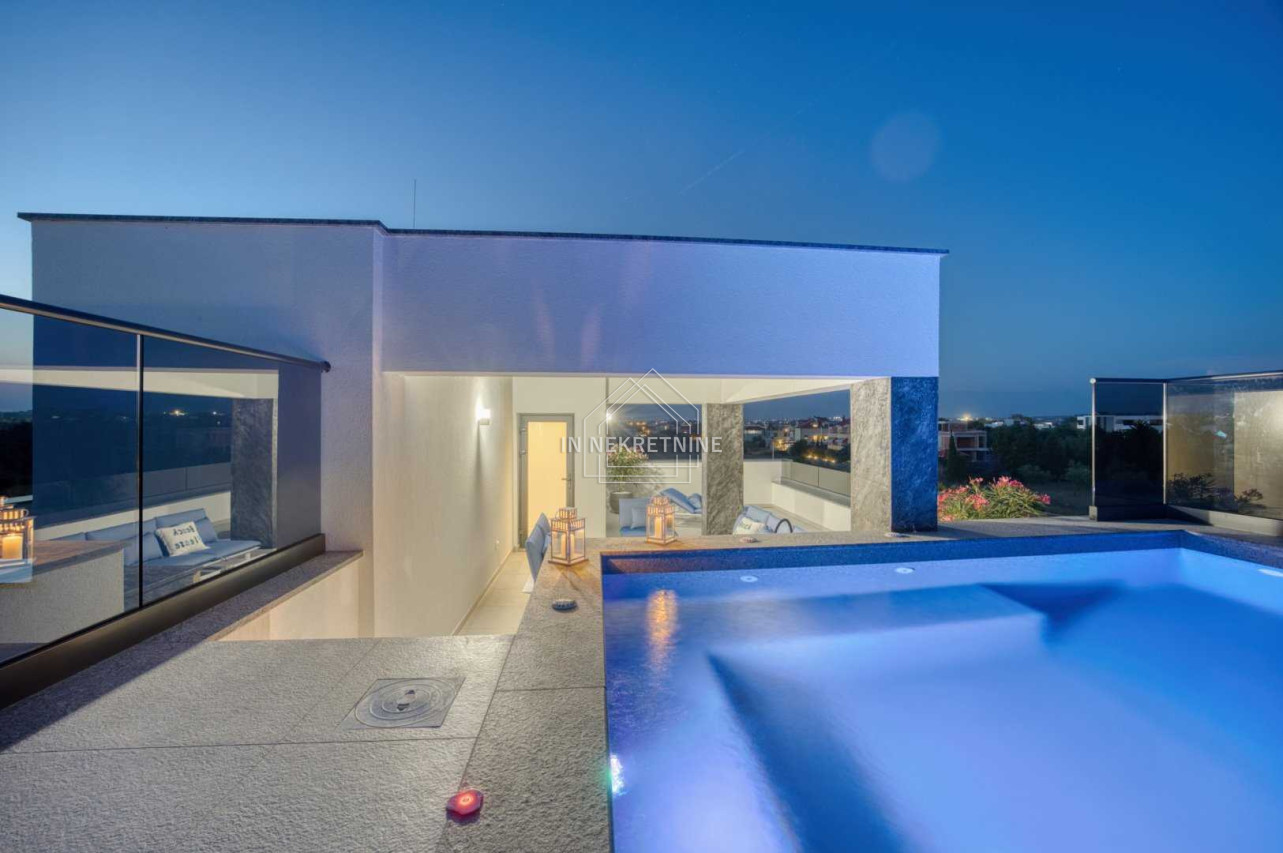 Vila ima dva grijana bazena jedan u dvorištu površine 32 m2 a drugi na krovnoj terasi površine 12 m2. U izgradnji i opremanju su korišteni isključivo najkvalitetniji materijali od renomiranih proizvođača. Vila je građena da zadovolji standarde 5* (u slučaju da se budući vlasnik želi baviti turizmom). Potpuno je klimatizirana a za grijanje se koriste dizalice topline(cijela kuća). S prve i druge etaže se pruža pogled na more. Prodaje se kompletno namještena i opremljena kao na slikama. Više informacija na upit!!